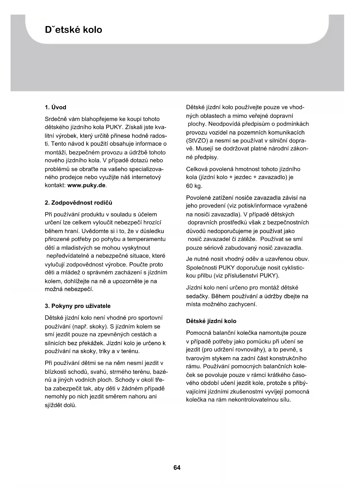 Srdečně vám blahopřejeme ke koupi tohoto dětského jízdního kola PUKY. Získali jste kvalitní výrobek, který určitě přinese hodně radosti. Tento návod k použití obsahuje informace o montáži, bezpečném provozu a údržbě tohoto nového jízdního kola. V případě dotazů nebo problémů se obraťte na vašeho specializovaného prodejce nebo využijte náš internetový kontakt: www.puky.de.