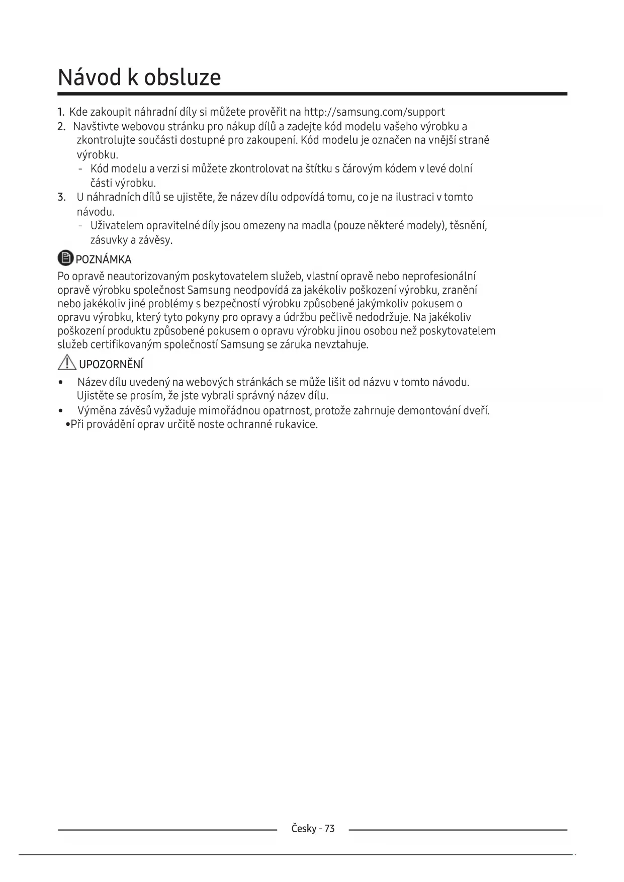návodu. ‐ Uživatelem opravitelné díly jsou omezeny na madla (pouze některé modely), těsnění, zásuvky a závěsy. POZNÁMKA Po opravě neautorizovaným poskytovatelem služeb, vlastní opravě nebo neprofesionální opravě výrobku společnost Samsung neodpovídá za jakékoliv poškození výrobku, zranění nebo jakékoliv jiné problémy s bezpečností výrobku způsobené jakýmkoliv pokusem o opravu výrobku, který tyto pokyny pro opravy a údržbu pečlivě nedodržuje. Na jakékoliv poškození produktu způsobené pokusem o opravu výrobku jinou osobou než poskytovatelem služeb certifikovaným společností Samsung se záruka nevztahuje. UPOZORNĚNÍ