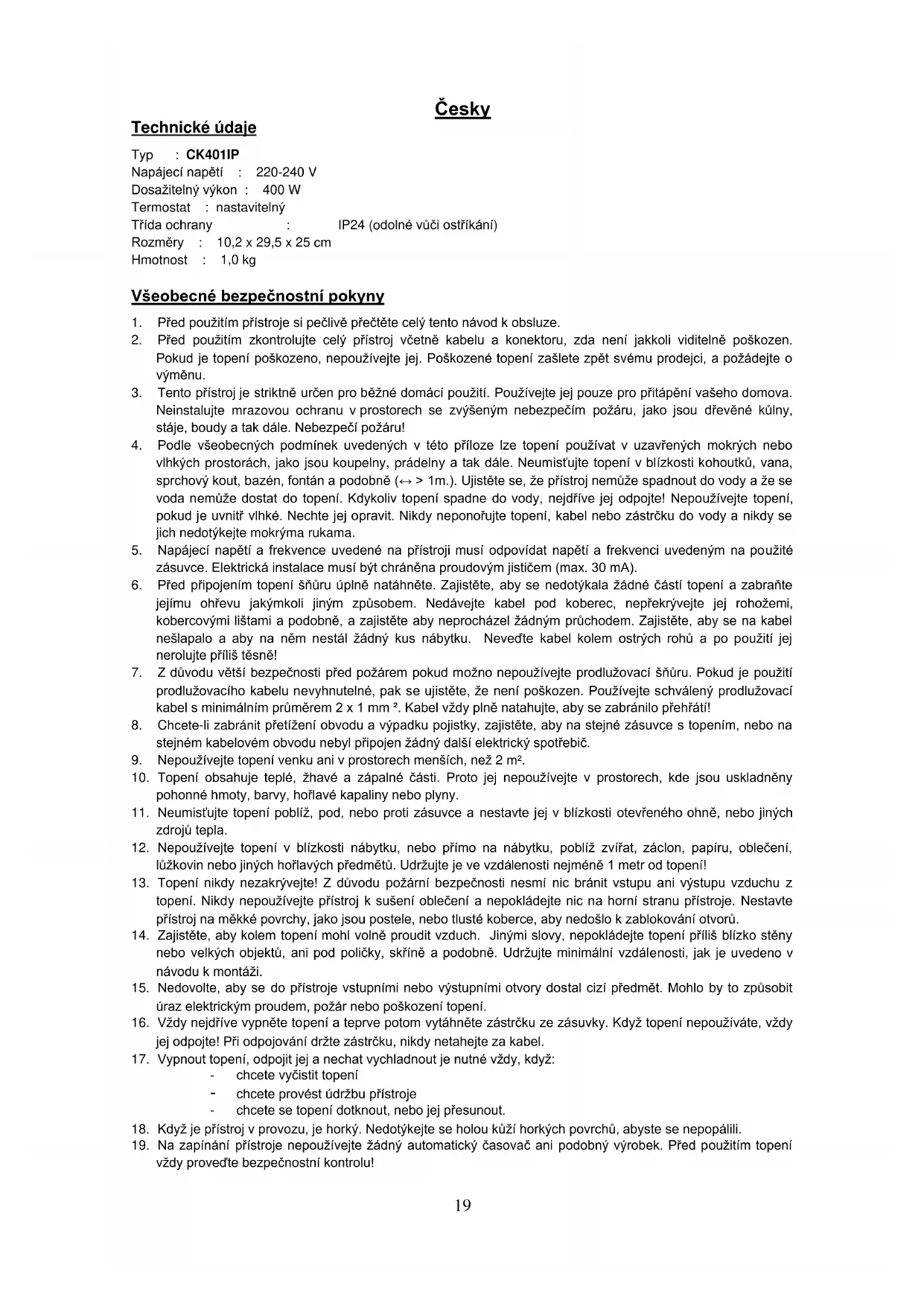 CK401IP - Elektrické vytápění Eurom - Bezplatný návod k obsluze