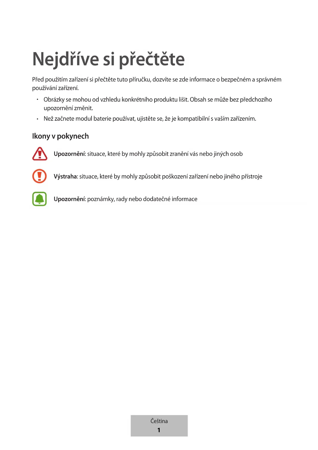 Než začnete modul baterie používat, ujistěte se, že je kompatibilní svaším zařízením. Ikony v pokynech Upozornění: situace, které by mohly způsobit zranění vás nebo jiných osob Výstraha: situace, které by mohly způsobit poškození zařízení nebo jiného přístroje Upozornění: poznámky, rady nebo dodatečné informace Čeština