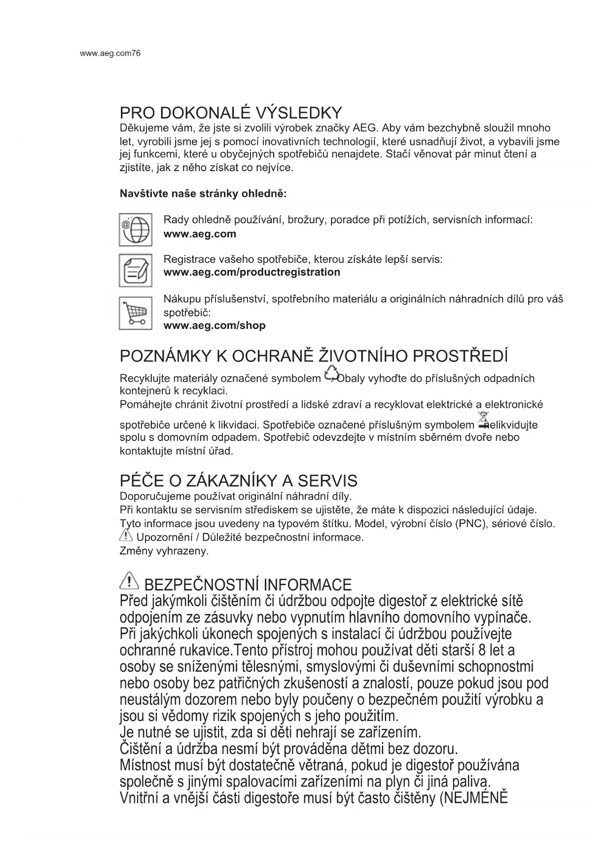 Děkujeme vám, že jste si zvolili výrobek značky AEG. Aby vám bezchybně sloužil mnoho let, vyrobili jsme jej s pomocí inovativních technologií, které usnadňují život, a vybavili jsme jej funkcemi, které u obyčejných spotřebičů nenajdete. Stačí věnovat pár minut čtení a zjistíte, jak z něho získat co nejvíce. Navštivte naše stránky ohledně: Rady ohledně používání, brožury, poradce při potížích, servisních informací: www.aeg.com Registrace vašeho spotřebiče, kterou získáte lepší servis: www.aeg.com/productregistration Nákupu příslušenství, spotřebního materiálu a originálních náhradních dílů pro váš spotřebič: www.aeg.com/shop POZNÁMKY K OCHRANĚ ŽIVOTNÍHO PROSTŘEDÍ Recyklujte materiály označené symbolem . Obaly vyhoďte do příslušných odpadních kontejnerů k recyklaci. Pomáhejte chránit životní prostředí a lidské zdraví a recyklovat elektrické a elektronické spotřebiče určené k likvidaci. Spotřebiče označené příslušným symbolem nelikvidujte spolu s domovním odpadem. Spotřebič odevzdejte v místním sběrném dvoře nebo kontaktujte místní úřad. PÉČE O ZÁKAZNÍKY A SERVIS Doporučujeme používat originální náhradní díly. Při kontaktu se servisním střediskem se ujistěte, že máte k dispozici následující údaje. Tyto informace jsou uvedeny na typovém štítku. Model, výrobní číslo (PNC), sériové číslo. Upozornění / Důležité bezpečnostní informace. Změny vyhrazeny.