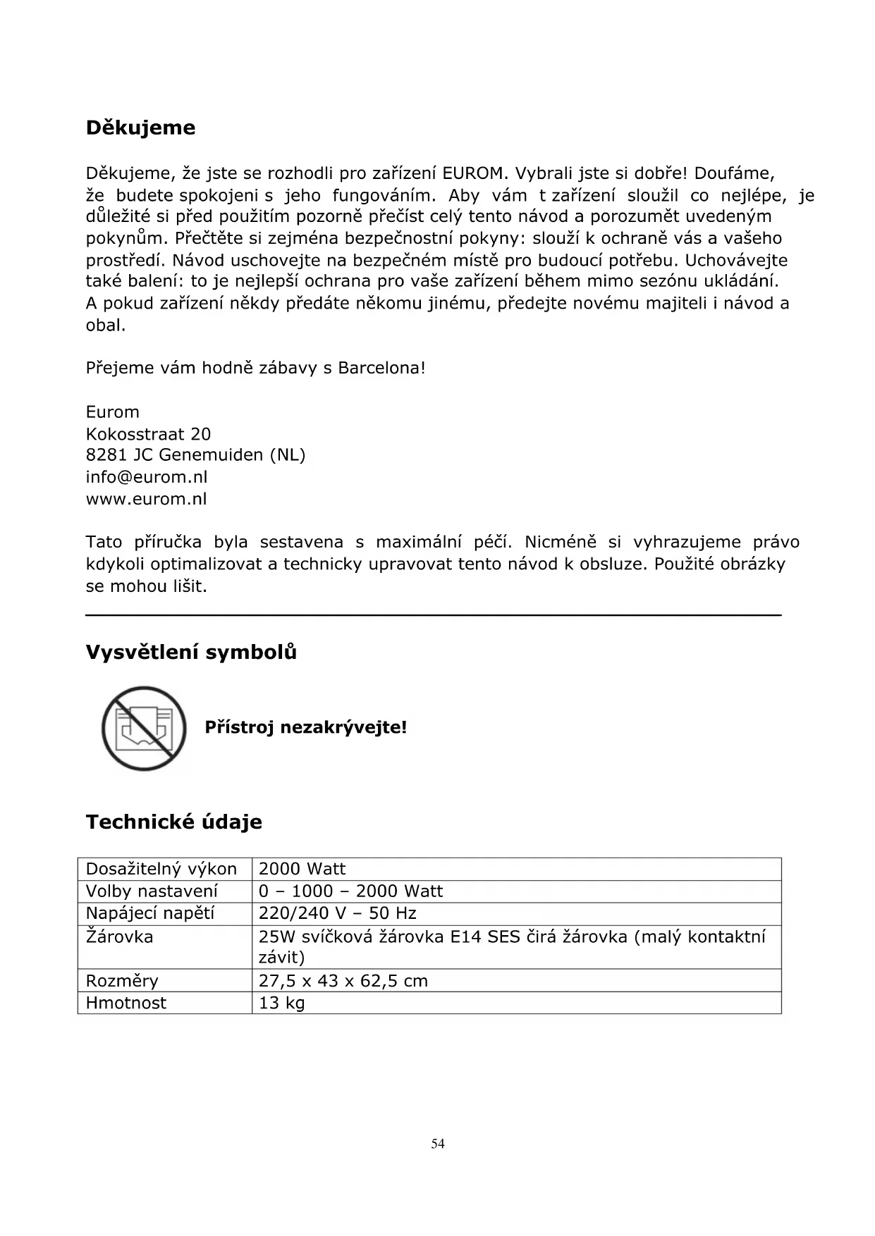 Děkujeme Děkujeme, že jste se rozhodli pro zařízení EUROM. Vybrali jste si dobře! Doufáme, že budete spokojeni s jeho fungováním. Aby vám t zařízení sloužil co nejlépe, je důležité si před použitím pozorně přečíst celý tento návod a porozumět uvedeným pokynům. Přečtěte si zejména bezpečnostní pokyny: slouží k ochraně vás a vašeho prostředí. Návod uschovejte na bezpečném místě pro budoucí potřebu. Uchovávejte také balení: to je nejlepší ochrana pro vaše zařízení během mimo sezónu ukládání. A pokud zařízení někdy předáte někomu jinému, předejte novému majiteli i návod a obal. Přejeme vám hodně zábavy s Barcelona! Eurom Kokosstraat 20 8281 JC Genemuiden (NL) info@eurom.nl www.eurom.nl Tato příručka byla sestavena s maximální péčí. Nicméně si vyhrazujeme právo kdykoli optimalizovat a technicky upravovat tento návod k obsluze. Použité obrázky se mohou lišit.