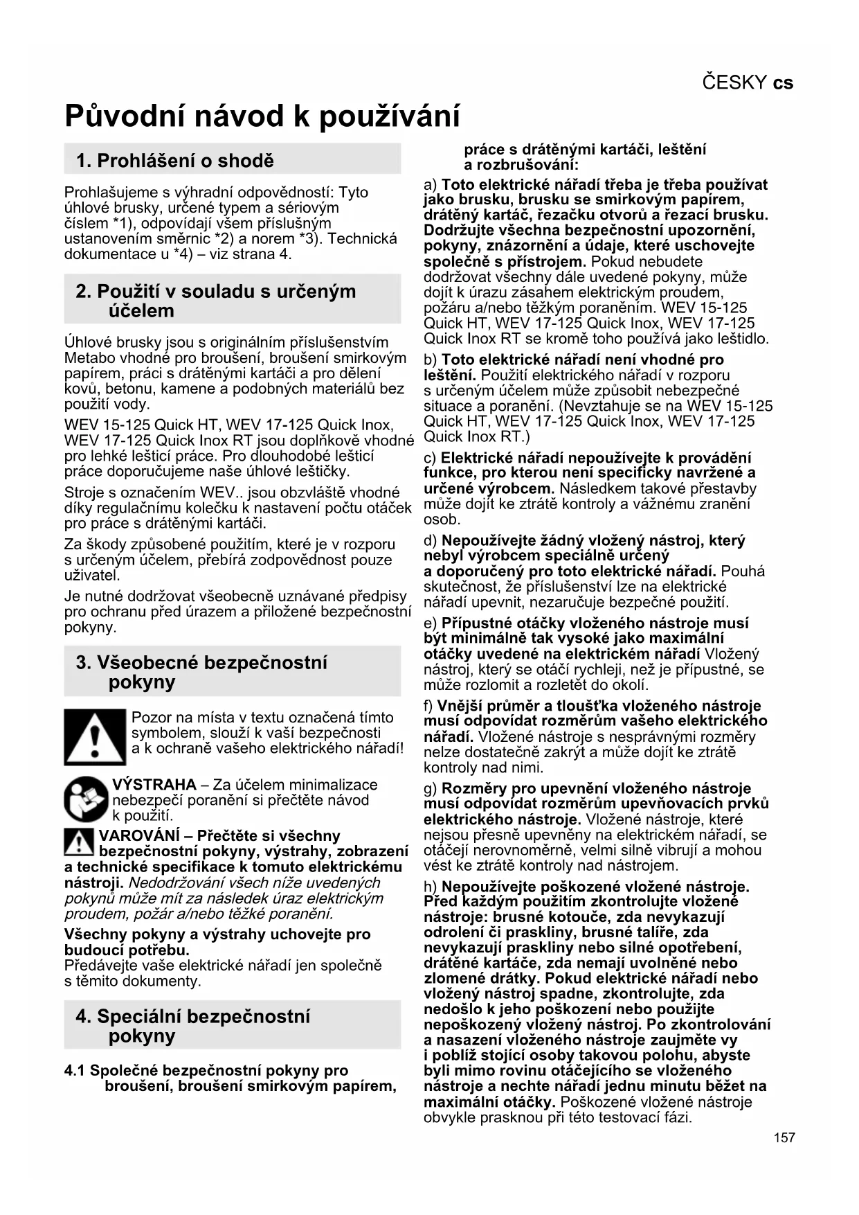 Původní návod k používání Prohlašujeme s výhradní odpovědností: Tyto úhlové brusky, určené typem a sériovým číslem *1), odpovídají všem příslušným ustanovením směrnic *2) a norem *3). Technická dokumentace u *4) – viz strana 4. Úhlové brusky jsou s originálním příslušenstvím Metabo vhodné pro broušení, broušení smirkovým papírem, práci s drátěnými kartáči a pro dělení kovů, betonu, kamene a podobných materiálů bez použití vody. WEV 15-125 Quick HT, WEV 17-125 Quick Inox, WEV 17-125 Quick Inox RT jsou doplňkově vhodné pro lehké lešticí práce. Pro dlouhodobé lešticí práce doporučujeme naše úhlové leštičky. Stroje s označením WEV.. jsou obzvláště vhodné díky regulačnímu kolečku k nastavení počtu otáček pro práce s drátěnými kartáči. Za škody způsobené použitím, které je v rozporu s určeným účelem, přebírá zodpovědnost pouze uživatel. Je nutné dodržovat všeobecně uznávané předpisy pro ochranu před úrazem a přiložené bezpečnostní pokyny. Pozor na místa v textu označená tímto symbolem, slouží k vaší bezpečnosti a k ochraně vašeho elektrického nářadí! VÝSTRAHA – Za účelem minimalizace nebezpečí poranění si přečtěte návod k použití. VAROVÁNÍ – Přečtěte si všechny bezpečnostní pokyny, výstrahy, zobrazení a technické specifikace k tomuto elektrickému nástroji. Nedodržování všech níže uvedených pokynů může mít za následek úraz elektrickým proudem, požár a/nebo těžké poranění. Všechny pokyny a výstrahy uchovejte pro budoucí potřebu. Předávejte vaše elektrické nářadí jen společně s těmito dokumenty.
