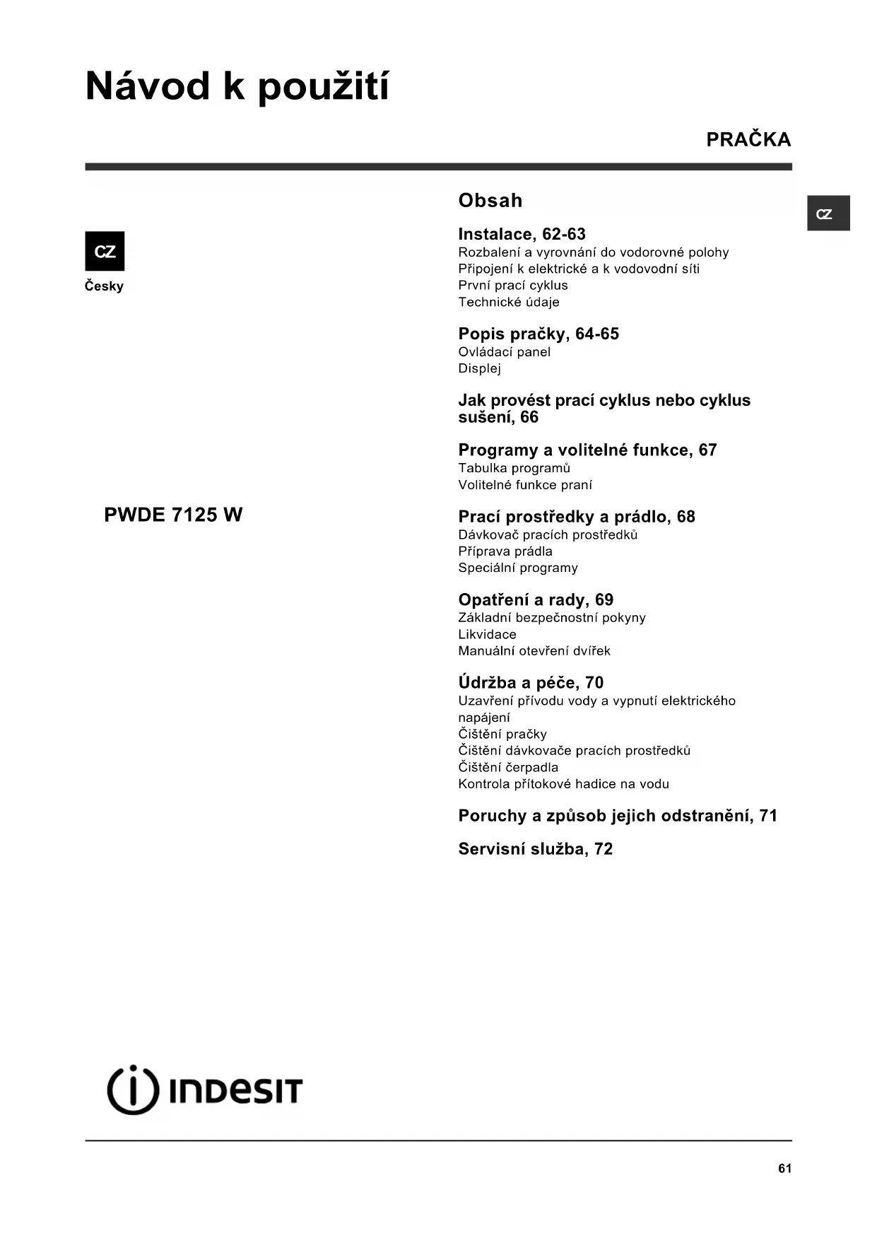 PRAÈKA Obsah Instalace, 62-63 Rozbalení a vyrovnání do vodorovné polohy Pøipojení kelektrické a kvodovodní síti První prací cyklus Technické údaje Popis praèky, 64-65 Ovládací panel Displej Jak provést prací cyklus nebo cyklus suení, 66 Programy a volitelné funkce, 67 Tabulka programù Volitelné funkce praní Prací prostøedky a prádlo, 68 Dávkovaè pracích prostøedkù Pøíprava prádla Speciální programy Opatøení a rady, 69 Základní bezpeènostní pokyny Likvidace Manuální otevøení dvíøek Údrba a péèe, 70 Uzavøení pøívodu vody a vypnutí elektrického napájení Èitìní praèky Èitìní dávkovaèe pracích prostøedkù Èitìní èerpadla Kontrola pøítokové hadice na vodu Poruchy a zpùsob jejich odstranìní, 71 Servisní sluba, 72 PWDE 7125 W Návod k pouití62