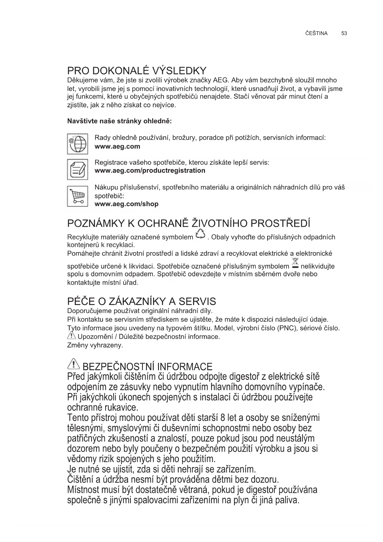 Děkujeme vám, že jste si zvolili výrobek značky AEG. Aby vám bezchybně sloužil mnoho let, vyrobili jsme jej s pomocí inovativních technologií, které usnadňují život, a vybavili jsme jej funkcemi, které u obyčejných spotřebičů nenajdete. Stačí věnovat pár minut čtení a zjistíte, jak z něho získat co nejvíce. Navštivte naše stránky ohledně: Rady ohledně používání, brožury, poradce při potížích, servisních informací: www.aeg.com Registrace vašeho spotřebiče, kterou získáte lepší servis: www.aeg.com/productregistration Nákupu příslušenství, spotřebního materiálu a originálních náhradních dílů pro váš spotřebič: www.aeg.com/shop POZNÁMKY K OCHRANĚ ŽIVOTNÍHO PROSTŘEDÍ Recyklujte materiály označené symbolem . Obaly vyhoďte do příslušných odpadních kontejnerů k recyklaci. Pomáhejte chránit životní prostředí a lidské zdraví a recyklovat elektrické a elektronické spotřebiče určené k likvidaci. Spotřebiče označené příslušným symbolem nelikvidujte spolu s domovním odpadem. Spotřebič odevzdejte v místním sběrném dvoře nebo kontaktujte místní úřad. PÉČE O ZÁKAZNÍKY A SERVIS Doporučujeme používat originální náhradní díly. Při kontaktu se servisním střediskem se ujistěte, že máte k dispozici následující údaje. Tyto informace jsou uvedeny na typovém štítku. Model, výrobní číslo (PNC), sériové číslo. Upozornění / Důležité bezpečnostní informace. Změny vyhrazeny.