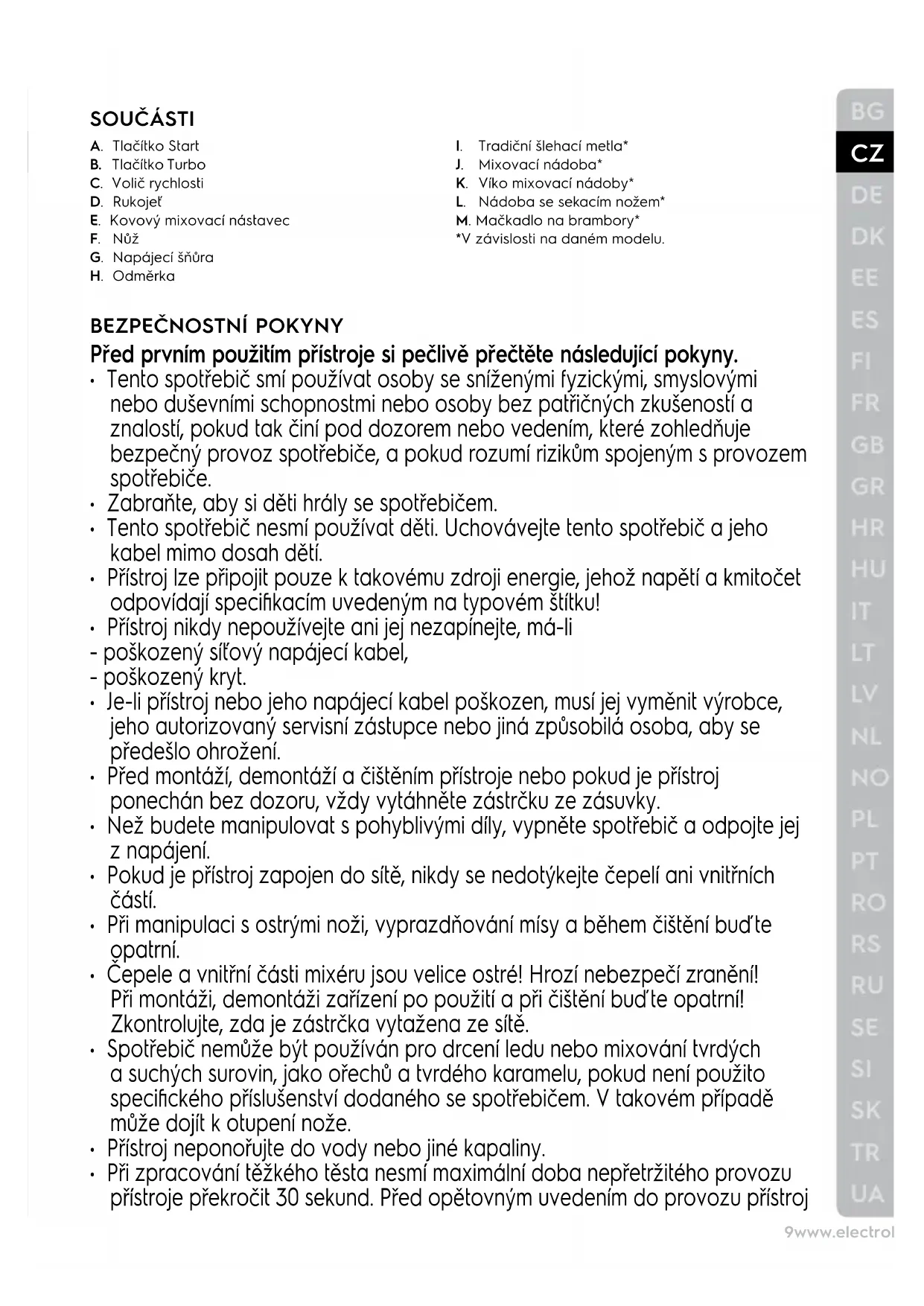 SOUČÁSTI A. Tlačítko Start B. Tlačítko Turbo C. Volič rychlosti D. Rukojeť E. Kovový mixovací nástavec F. Nůž G. Napájecí šňůra H. Odměrka