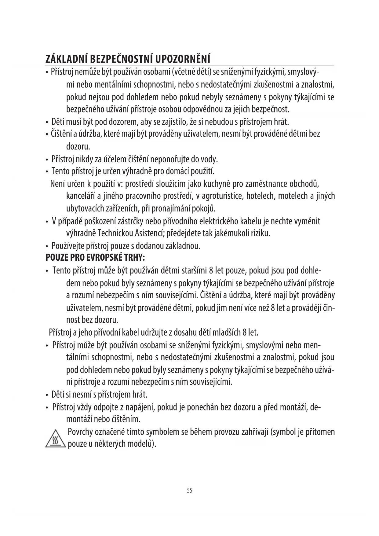 - Tento přístroj může být používán dětmi staršími 8 let pouze, pokud jsou pod dohle- dem nebo pokud byly seznámeny s pokyny týkajícími se bezpečného užívání přístroje a rozumí nebezpečím s ním souvisejícími. Čištění a údržba, které mají být prováděny uživatelem, nesmí být prováděné dětmi, pokud jim není více než 8 let a provádějí čin- nost bez dozoru. Přístroj a jeho přívodní kabel udržujte zdosahu dětí mladších 8 let.