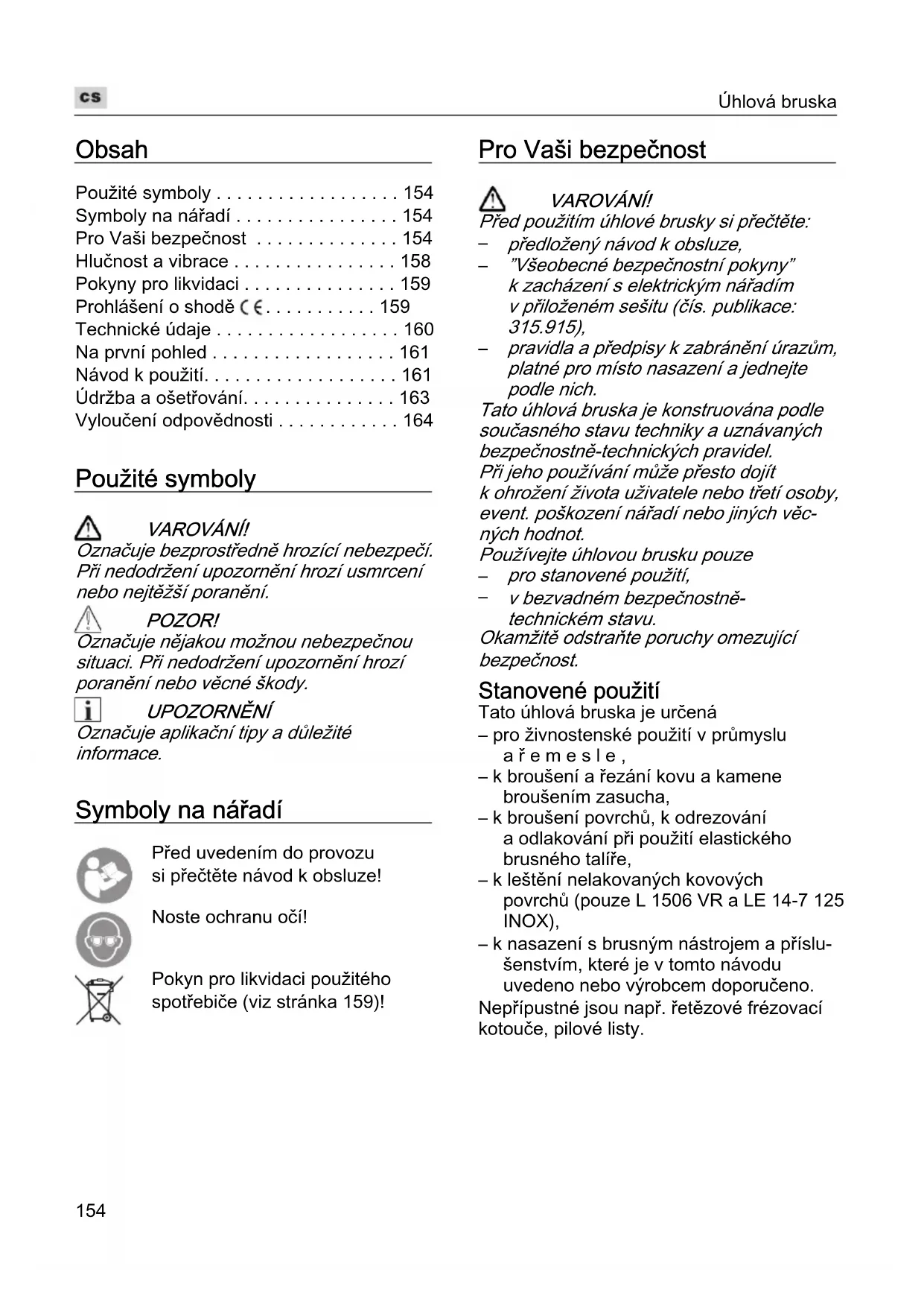 - Vyloučení odpovědnosti Použité symboly VAROVÁNÍ! Označuje bezprostředně hrozící nebezpečí. Při nedodržení upozornění hrozí usmrcení nebo nejtěžší poranění. POZOR! Označuje nějakou možnou nebezpečnou situaci. Při nedodržení upozornění hrozí poranění nebo věcné škody. UPOZORNĚNÍ Označuje aplikační tipy a důležité informace. Symboly na nářadí Před uvedením do provozu si přečtěte návod k obsluze! Noste ochranu očí! Pokyn pro likvidaci použitého spotřebiče (viz stránka 159)! Pro Vaši bezpečnost VAROVÁNÍ! Před použitím úhlové brusky si přečtěte: p. 164