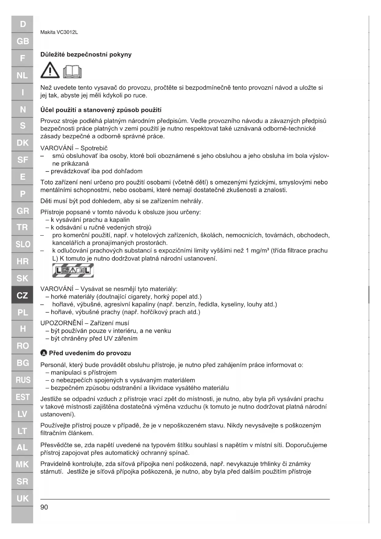 Makita VC3012L Důležité bezpečnostní pokyny Než uvedete tento vysavač do provozu, pročtěte si bezpodmínečně tento provozní návod a uložte si jej tak, abyste jej měli kdykoli po ruce. Účel použití a stanovený způsob použití Provoz stroje podléhá platným národním předpisům. Vedle provozního návodu a závazných předpisů bezpečnosti práce platných v zemi použití je nutno respektovat také uznávaná odborně-technické zásady bezpečné a odborně správné práce. VAROVÁNÍ – Spotrebič – smú obsluhovať iba osoby, ktoré boli oboznámené s jeho obsluhou a jeho obsluha ím bola výslov- ne prikázaná – prevádzkovať iba pod dohľadom Toto zařízení není určeno pro použití osobami (včetně dětí) s omezenými fyzickými, smyslovými nebo mentálními schopnostmi, nebo osobami, které nemají dostatečné zkušenosti a znalosti. Děti musí být pod dohledem, aby si se zařízením nehrály. Přístroje popsané v tomto návodu k obsluze jsou určeny: – k vysávání prachu a kapalin – k odsávání u ručně vedených strojů – pro komerční použití, např. v hotelových zařízeních, školách, nemocnicích, továrnách, obchodech, kancelářích a pronajímaných prostorách. – k odlučování prachových substancí s expozičními limity vyššími než 1 mg/m³ (třída ltrace prachu L) K tomuto je nutno dodržovat platná národní ustanovení. VAROVÁNÍ – Vysávat se nesmějí tyto materiály: – horké materiály (doutnající cigarety, horký popel atd.) – hořlavé, výbušné, agresivní kapaliny (např. benzín, ředidla, kyseliny, louhy atd.) – hořlavé, výbušné prachy (např. hořčíkový prach atd.) UPOZORNĚNÍ – Zařízení musí – být používán pouze v interiéru, a ne venku – být chráněny před UV zářením