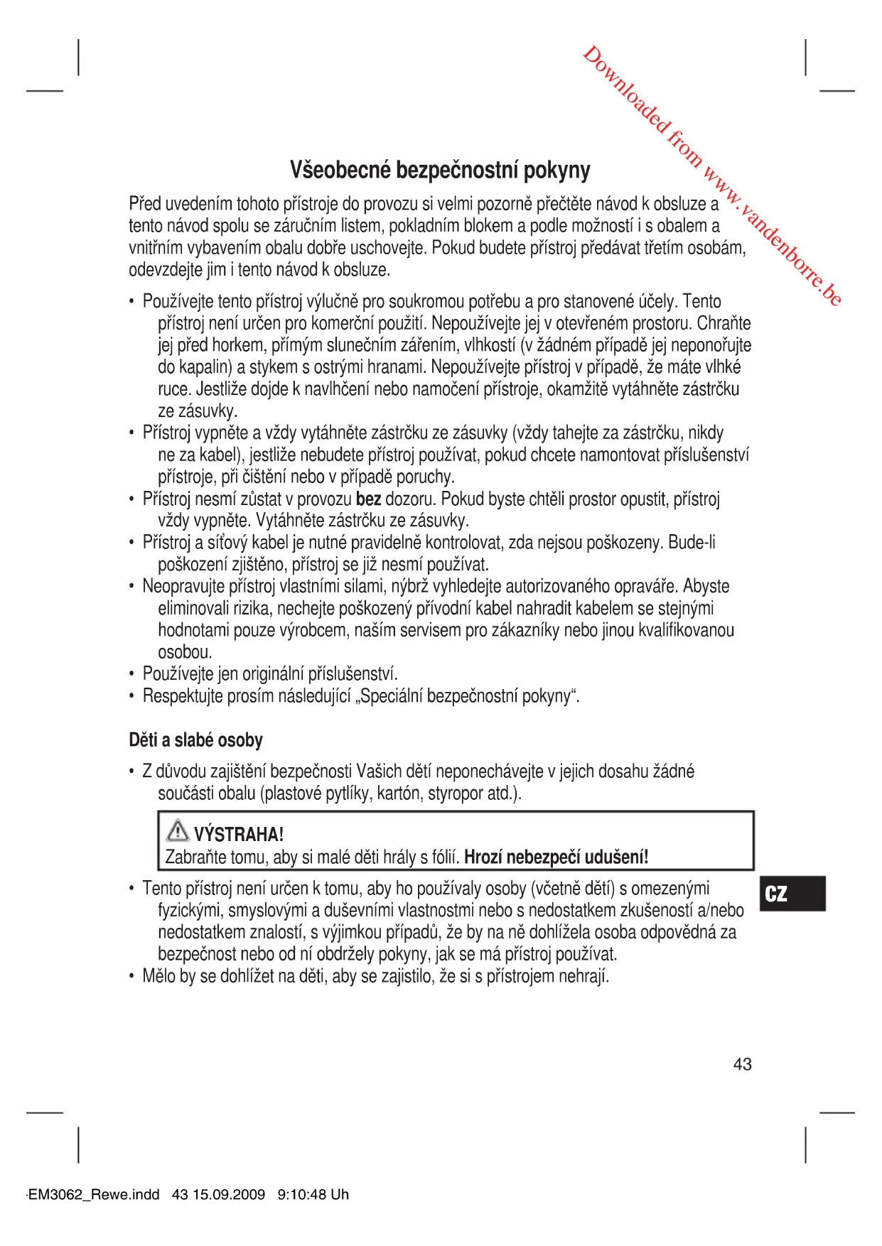 - Mělo by se dohlížet na děti, aby se zajistilo, že si s přístrojem nehrají. 05-EM3062_Rewe.indd 43 15.09.2009 9:10:48 Uhr Downloaded from www.vandenborre.beCZ