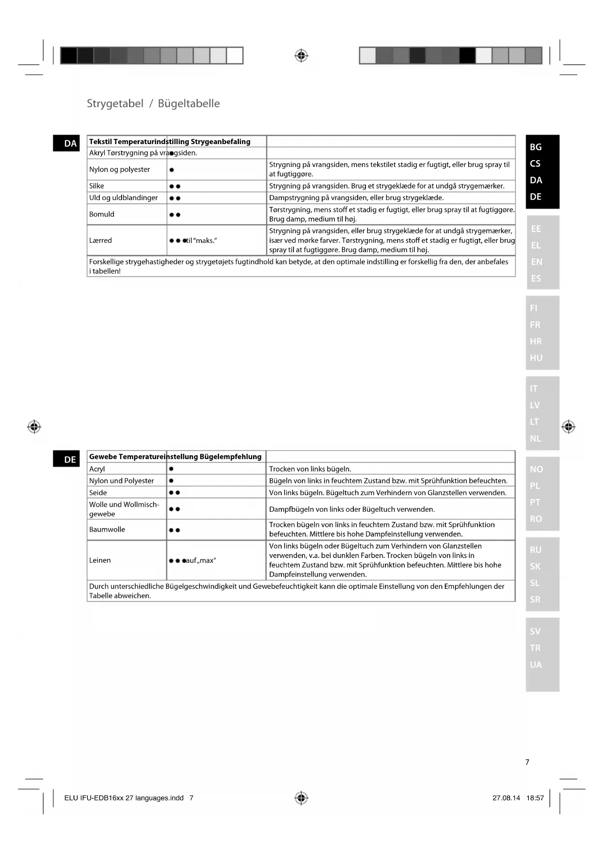 k síťové zásuvce. Rozsvítí se světelný indikátor napájení. Otočením voliče teploty do odpovídající polohy nastavte požadovanou teplotu. Po zhasnutí světelného indikátoru je žehlička připravena k použití. Parní žehlení je možné pouze s nejvyššími nastavenými teplotami. ZačínámeПърви стъпки / ELU IFU-EDB16xx 27 languages.indd 8ELU IFU-EDB16xx 27 languages.indd 8 27.08.14 18:5727.08.14 18:579