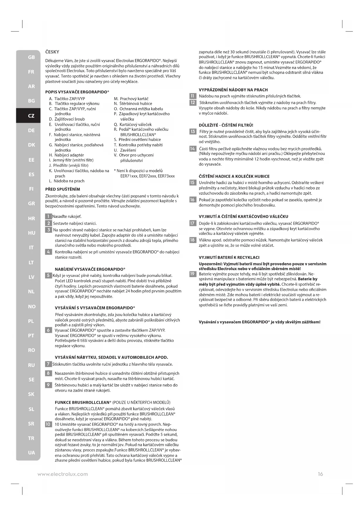 Upozornění: Vyjmutí baterií musí být provedeno pouze v servisním středisku Electrolux nebo v ociálním sběrném místě! 19 Baterie vyjměte pouze tehdy, má-li být spotřebič zlikvidován. Ne- správná manipulace s bateriemi může být nebezpečná. Baterie by měly být před vyjmutím vždy úplně vybité. Chcete-li spotřebič re- cyklovat, odevzdejte ho v servisním středisku Electrolux nebo ociálním sběrném místě. Zde mohou baterii i elektrické součásti vyjmout a re- cyklovat bezpečně a odborně. Při sběru dobíjecích baterií a elektrických spotřebičů se řiďte pravidly platnými ve vaší zemi. Vysávání s vysavačem ERGORAPIDO® je vždy skvělým zážitkem! 16www.electrolux.com