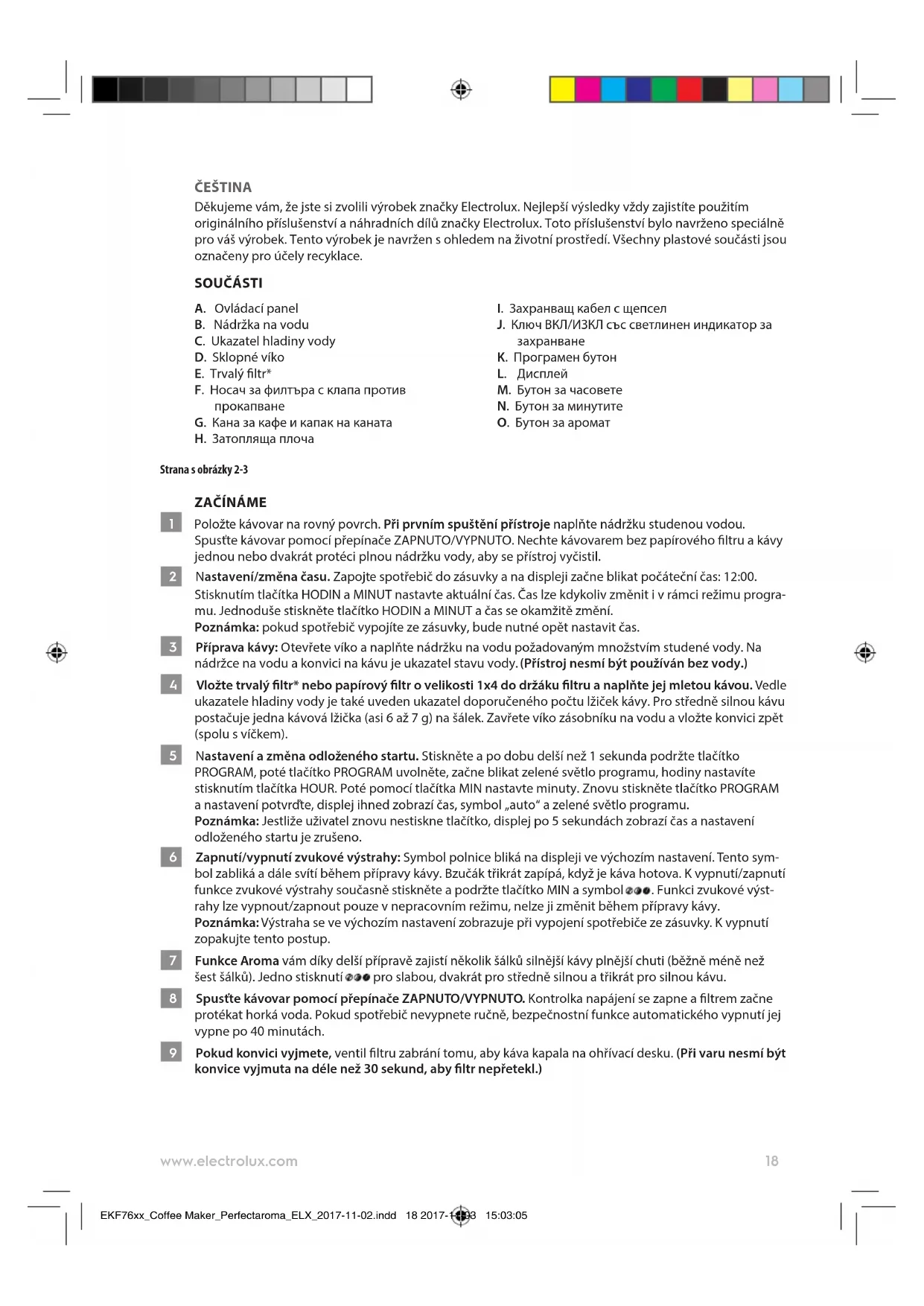 - Přístroj nepoužívejte při otevřeném víku. Tento spotřebič je určen pro použití v domácnosti a pro následující způsoby použití: - kuchyňky pro zaměstnance v obchodech, kancelářích a jiných pracovních prostředích; - farmářské domy; - pro zákazníky hotelů, motelů a jiných ubytovacích zařízení; - penziony a ubytovny. LIKVIDACE Tento symbol na výrobku označuje, že obsahuje baterie, která by neměla být likvidována společně s běžným domovním odpadem. Tento symbol na výrobku nebo na jeho obalu znamená, že tento spotřebič nepatří do domovního odpadu. Chcete-li výrobek recyklovat, odneste jej do ociálního sběrného místa nebo do servisního střediska společnosti Electrolux, kde mohou baterii a další elektrické součásti vyjmout a recyklovat bezpečným a profesionálním způsobem. Postupujte podle zákonů platných ve vaší zemi, které se týkají sběru separovaných odpadních elektrických výrobků a nabíjecích baterií. Společnost Electrolux si vyhrazuje právo měnit výrobky, informace i technické údaje bez předchozího upozornění. EKF76xx_Coffee Maker_Perfectaroma_ELX_2017-11-02.indd 20 2017-11-03 15:03:0521 www.electrolux.com