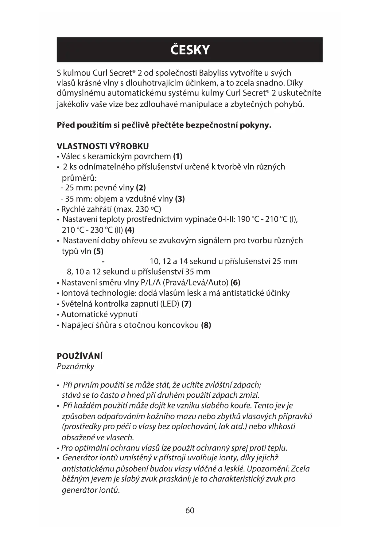 ČESKY S kulmou Curl Secret® 2 odspolečnosti Babyliss vytvoříte usvých vlasů krásné vlny sdlouhotrvajícím účinkem, ato zcela snadno. Díky důmyslnému automatickému systému kulmy Curl Secret® 2 uskutečníte jakékoliv vaše vize bez zdlouhavé manipulace azbytečných pohybů. Před použitím si pečlivě přečtěte bezpečnostní pokyny.