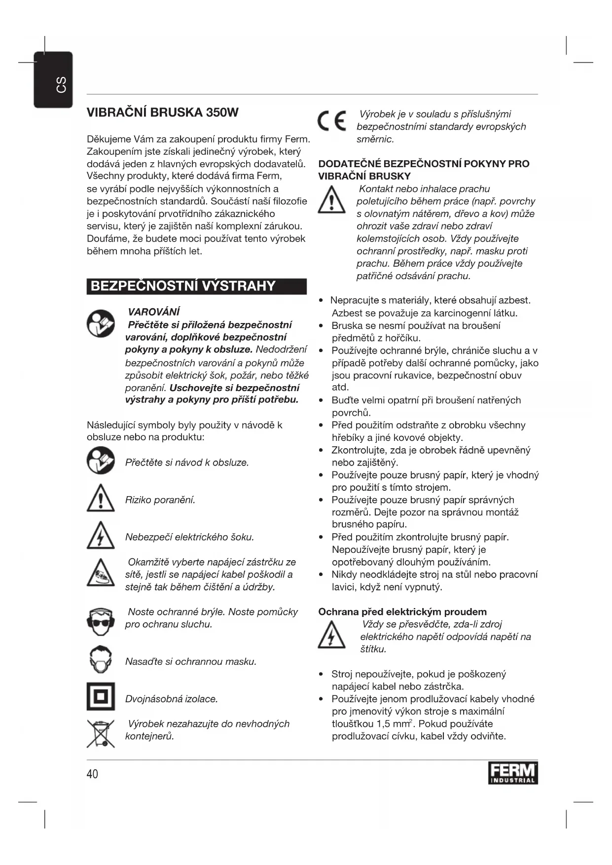 Děkujeme Vám za zakoupení produktu firmy Ferm. Zakoupením jste získali jedinečný výrobek, který dodává jeden z hlavných evropských dodavatelů. Všechny produkty, které dodává firma Ferm, se vyrábí podle nejvyšších výkonnostních a bezpečnostních standardů. Součástí naší filozofie je i poskytování prvotřídního zákaznického servisu, který je zajištěn naší komplexní zárukou. Doufáme, že budete moci používat tento výrobek během mnoha příštích let.