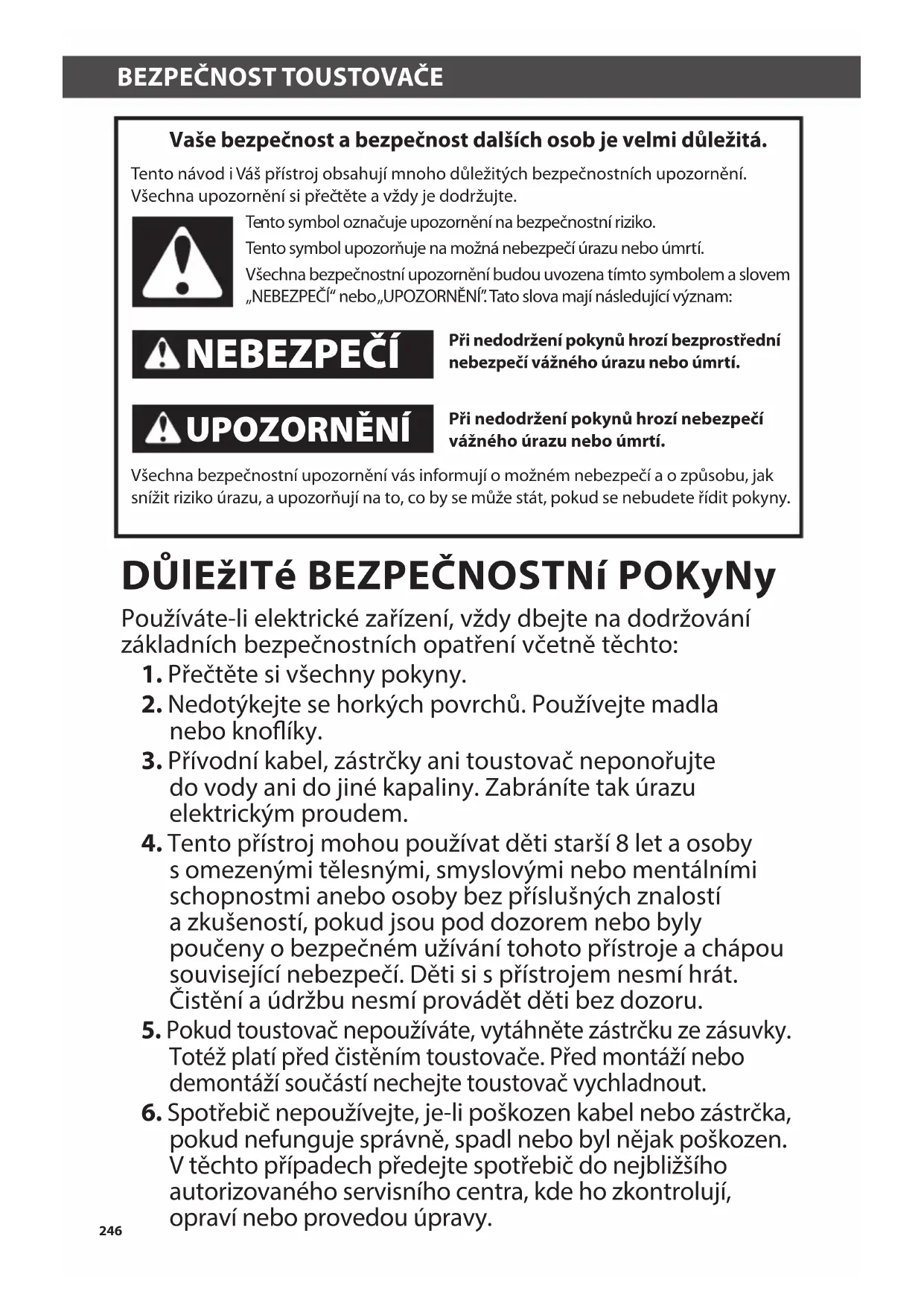 Záruka na toustovač ....................................................................................................... 259 Zákaznické služby ............................................................................................................ 260 OBSAH W10506838B_16_CZ.indd 245 2/12/14 2:16 PM246 BEZPEČNOST TOUSTOVAČEBEZPEČNOST TOUSTOVAČE Vaše bezpečnost a bezpečnost dalších osob je velmi důležitá. Tento návod i Váš přístroj obsahují mnoho důležitých bezpečnostních upozornění. Všechna upozornění si přečtěte a vždy je dodržujte. Tento symbol označuje upozornění na bezpečnostní riziko. Tento symbol upozorňuje na možná nebezpečí úrazu nebo úmrtí. Všechna bezpečnostní upozornění budou uvozena tímto symbolem a slovem „NEBEZPEČÍ“ nebo „UPOZORNĚNÍ”. Tato slova mají následující význam: Při nedodržení pokynů hrozí bezprostřední nebezpečí vážného úrazu nebo úmrtí. Při nedodržení pokynů hrozí nebezpečí vážného úrazu nebo úmrtí. Všechna bezpečnostní upozornění vás informují o možném nebezpečí a o způsobu, jak snížit riziko úrazu, a upozorňují na to, co by se může stát, pokud se nebudete řídit pokyny. NEBEZPEČÍ UPOZORNĚNÍ Používáte-li elektrické zařízení, vždy dbejte na dodržování základních bezpečnostních opatření včetně těchto: