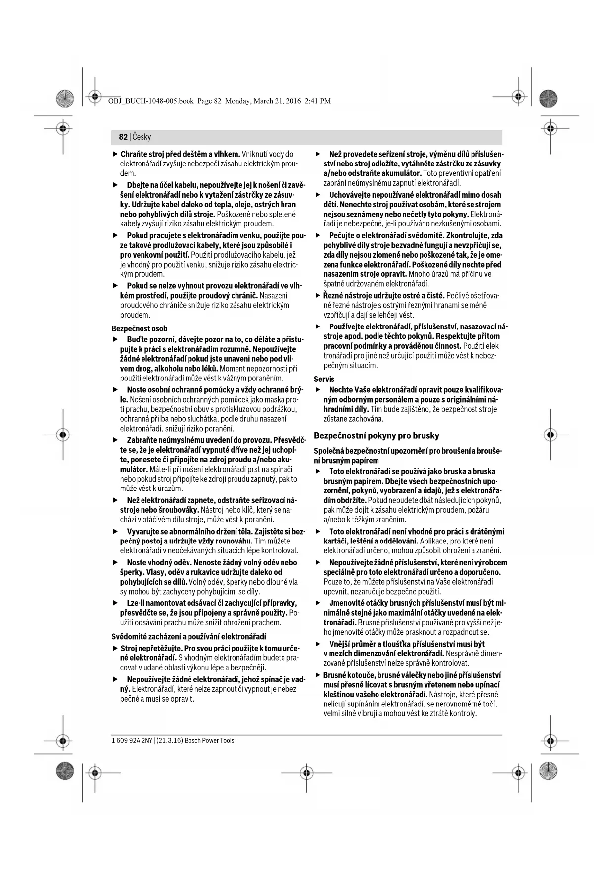 znajdującej się w danych podanych przez producenta narzędzia roboczego. Nie może ona być mniejsza niż maksymalna prędkość ob- rotowa elektronarzędzia. Odsysanie pyłów/wiórów Pyły niektórych materiałów, na przykład powłok malar- skich z zawartością ołowiu, niektórych gatunków drewna, minerałów lub niektórych rodzajów metalu, mogą stano- wić zagrożenie dla zdrowia. Bezpośredni kontakt fizyczny z pyłami lub przedostanie się ich do płuc może wywołać re- akcje alergiczne i/lub choroby układu oddechowego ope- ratora lub osób znajdujących się w pobliżu. Niektóre rodzaje pyłów, np. dębiny lub buczyny uważane są za rakotwórcze, szczególnie w połączeniu z substancja- mi do obróbki drewna (chromiany, impregnaty do drew- na). Materiały, zawierające azbest mogą być obrabiane je- dynie przez odpowiednio przeszkolony personel. – Należy zawsze dbać o dobrą wentylację stanowiska pra- cy. – Zaleca się noszenie maski przeciwpyłowej z pochłania- czem klasy P2. Należy stosować się do aktualnie obowiązujących w danym kraju przepisów, regulujących zasady obchodzenia się z materiałami przeznaczonymi do obróbki. Należy unikać gromadzenia się pyłu na stanowisku pra- cy. Pyły mogą się z łatwością zapalić. Praca Uruchamianie Należy zwrócić uwagę na napięcie sieciowe! Napięcie źródła prądu musi zgadzać się z danymi na tabliczce znamionowej elektronarzędzia. Włączanie/wyłączanie Aby uruchomić elektronarzędzie należy najpierw przesunąć włącznik/wyłącznik 4 do przodu, a na zakończenie wcisnąć i przytrzymać w tej pozycji. W celu unieruchomienia włącznika/wyłącznika 4 w pozycji wciśniętej, należy przesunąć włącznik/wyłącznik 4 nieco da- lej do przodu. W celu wyłączenia elektronarzędzia, należy włącznik/wyłącz- nik 4 zwolnić lub, gdy jest on unieruchomiony, włącznik/wy- łącznik 4 krótko nacisnąć i następnie zwolnić. Narzędzia szlifierskie należy skontrolować przed uży- ciem. Narzędzie szlifierskie musi być prawidłowo za- montowane i musi się swobodnie obracać. W ramach testu uruchomić elektronarzędzie bez obciążenia na co najmniej jedną minutę. Nie stosować uszkodzonych lub wibrujących narzędzi szlifierskich. Narzędzia szlifier- skie muszą mieć okrągły kształt. Uszkodzone narzędzia szlifierskie mogą pęknąć i spowodować obrażenia. Aby zaoszczędzić energię elektryczną, elektronarzędzie nale- ży włączać tylko wówczas, gdy jest ono używane. Wskazówki dotyczące pracy Optymalne wyniki szlifowania osiąga się, przesuwając ścierni- cę równomiernie z lekkim naciskiem tam i z powrotem. Zbyt duży nacisk zmniejsza wydajność elektronarzędzia, a ścierni- ca zużywa się szybciej. Narzędzia szlifierskie należy przechowywać tak, aby były one chronione przed wstrząsami i uderzeniami. Henk Becker Executive Vice President Engineering Helmut Heinzelmann Head of Product Certification PT/ETM9 OBJ_BUCH-1048-005.book Page 80 Monday, March 21, 2016 2:41 PMČesky | 81 Bosch Power Tools 1 609 92A 2NY | (21.3.16) Konserwacja i serwis Konserwacja i czyszczenie Przed wszystkimi pracami przy elektronarzędziu nale- ży wyciągnąć wtyczkę z gniazda. Aby zapewnić bezpieczną i wydajną pracę, elektrona- rzędzie i szczeliny wentylacyjne należy utrzymywać w czystości. W skrajnie trudnych warunkach pracy należy w razie możliwości stosować stacjonarny system odsysania pyłu. Należy też często przedmuchiwać otwory wenty- lacyjne i stosować wyłącznik ochronny różnicowo-prą- dowy (PRCD). Podczas obróbki metali może dojść do osa- dzenia się wewnątrz elektronarzędzia pyłu metalicznego, mogącego przewodzić prąd. Może to mieć niekorzystny wpływ na izolację ochronną elektronarzędzia. Należy obchodzić się pieczołowicie z osprzętem – podczas przechowywania i podczas pracy. Jeżeli konieczna okaże się wymiana przewodu przyłączenio- wego, należy zlecić ją firmie Bosch lub w autoryzowanym przez firmę Bosch punkcie naprawy elektronarzędzi, co po- zwoli uniknąć ryzyka zagrożenia bezpieczeństwa. Obsługa klienta oraz doradztwo dotyczące użytkowania W punkcie obsługi klienta można uzyskać odpowiedzi na pyta- nia dotyczące napraw i konserwacji nabytego produktu, a tak- że dotyczące części zamiennych. Rysunki rozłożeniowe oraz informacje dotyczące części zamiennych można znaleźć rów- nież pod adresem: www.bosch-pt.com Nasz zespół doradztwa dotyczącego użytkowania odpowie na wszystkie pytania związane z produktami firmy Bosch oraz ich osprzętem. Przy wszystkich zgłoszeniach oraz zamówieniach części za- miennych konieczne jest podanie 10-cyfrowego numeru kata- logowego, znajdującego się na tabliczce znamionowej pro- duktu. Polska Robert Bosch Sp. z o.o. Serwis Elektronarzędzi Ul. Szyszkowa 35/37 02-285 Warszawa Na www.bosch-pt.pl znajdą Państwo wszystkie szczegóły dotyczące usług serwisowych online. Tel.: 22 7154460 Faks: 22 7154441 E-Mail: bsc@pl.bosch.com Infolinia Działu Elektronarzędzi: 801 100900 (w cenie połączenia lokalnego) E-Mail: elektronarzedzia.info@pl.bosch.com www.bosch.pl Usuwanie odpadów Elektronarzędzia, osprzęt i opakowanie należy poddać utyliza- cji zgodnie z obowiązującymi zasadami ochrony środowiska. Nie wolno wyrzucać elektronarzędzi do odpadów z gospodar- stwa domowego! Tylko dla państw należących do UE: Zgodnie z europejską wytyczną 2012/19/UE o starych, zużytych narzę- dziach elektrycznych i elektronicznych i jej stosowania w prawie krajowym, wyelimino- wane, niezdatne do użycia elektronarzędzia należy zbierać osobno i doprowadzić do po- nownego użytkowania zgodnego z zasadami ochrony środowiska. Zastrzega się prawo dokonywania zmian. Česky Bezpečnostní upozornění Všeobecná varovná upozornění pro elektronářadí Čtěte všechna varovná upozornění a pokyny. Zanedbání při dodržování va- rovných upozor