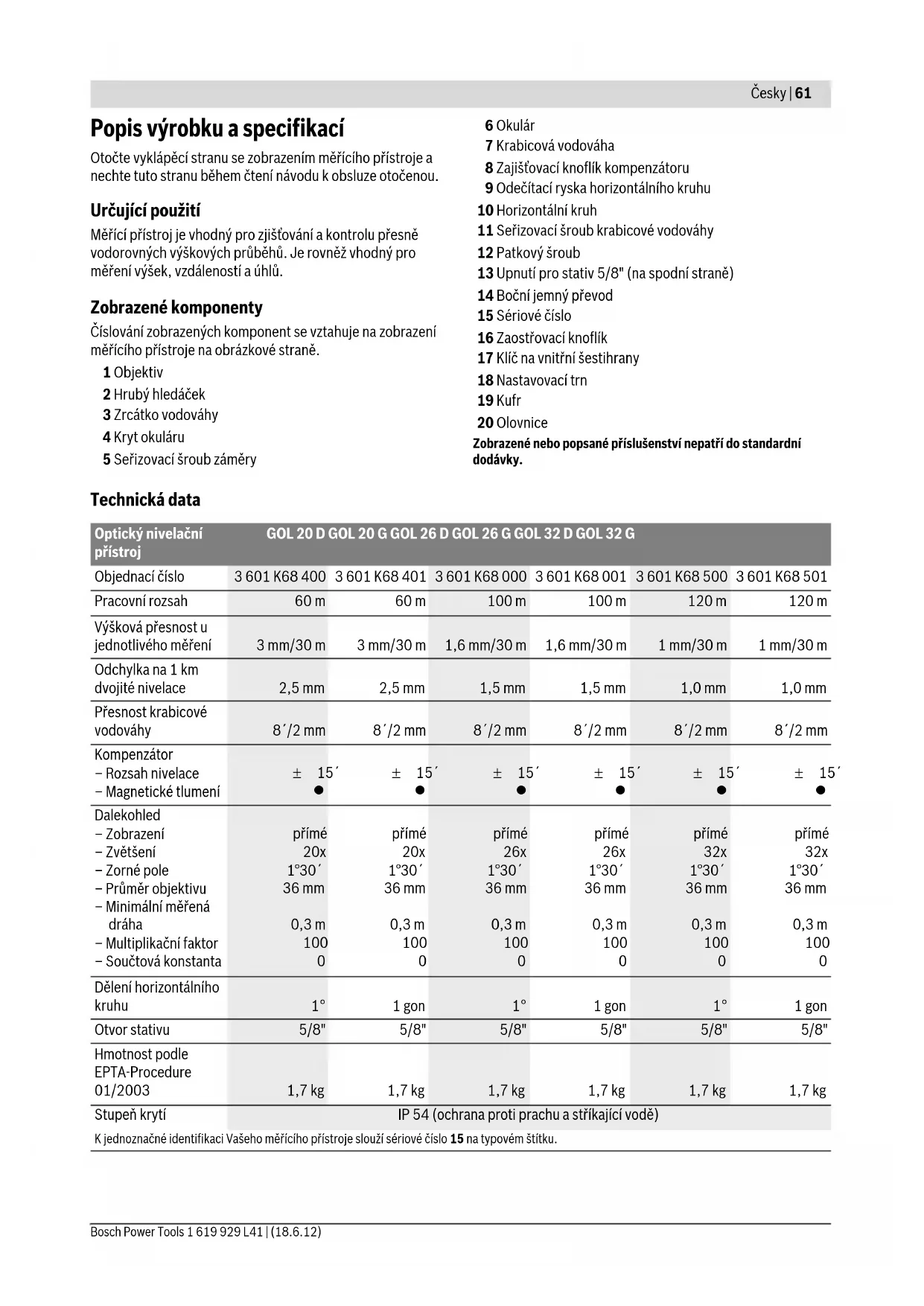 OBJ_BUCH-1239-002.book Page 60 Monday, June 18, 2012 10:51 AMČesky | 61 Bosch Power Tools 1 619 929 L41 | (18.6.12) Popis výrobku a specifikací Otočte vyklápěcí stranu se zobrazením měřícího přístroje a nechte tuto stranu během čtení návodu k obsluze otočenou. Určující použití Měřící přístroj je vhodný pro zjišťování a kontrolu přesně vodorovných výškových průběhů. Je rovněž vhodný pro měření výšek, vzdáleností a úhlů. Zobrazené komponenty Číslování zobrazených komponent se vztahuje na zobrazení měřícího přístroje na obrázkové straně. 1 Objektiv 2 Hrubý hledáček 3 Zrcátko vodováhy 4 Kryt okuláru 5 Seřizovací šroub záměry 6 Okulár 7 Krabicová vodováha 8 Zajišťovací knoflík kompenzátoru 9 Odečítací ryska horizontálního kruhu 10 Horizontální kruh 11 Seřizovací šroub krabicové vodováhy 12 Patkový šroub 13 Upnutí pro stativ 5/8" (na spodní straně) 14 Boční jemný převod 15 Sériové číslo 16 Zaostřovací knoflík 17 Klíč na vnitřní šestihrany 18 Nastavovací trn 19 Kufr 20 Olovnice Zobrazené nebo popsané příslušenství nepatří do standardní dodávky. Technická data Optický nivelační přístroj GOL 20 D GOL 20 G GOL 26 D GOL 26 G GOL 32 D GOL 32 G Objednací číslo 3 601 K68 400 3 601 K68 401 3 601 K68 000 3 601 K68 001 3 601 K68 500 3 601 K68 501 Pracovní rozsah 60 m 60 m 100 m 100 m 120 m 120 m Výšková přesnost u jednotlivého měření 3 mm/30 m 3 mm/30 m 1,6 mm/30 m 1,6 mm/30 m 1 mm/30 m 1 mm/30 m Odchylka na 1 km dvojité nivelace 2,5 mm 2,5 mm 1,5 mm 1,5 mm 1,0 mm 1,0 mm Přesnost krabicové vodováhy 8´/2 mm 8´/2 mm 8´/2 mm 8´/2 mm 8´/2 mm 8´/2 mm Kompenzátor – Rozsah nivelace – Magnetické tlumení ± 15´