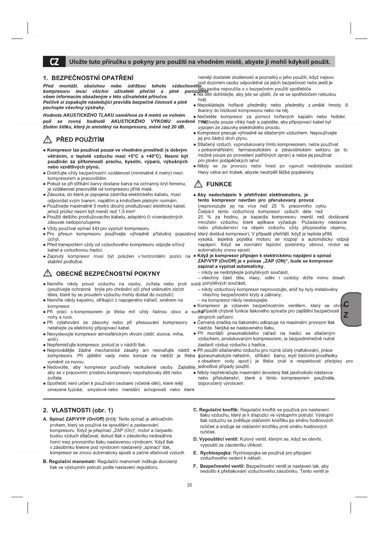 - Kompresor Ize použivat pouze ve vchodném prostředi (s dobrým větráním, o teplote vžduchu mezi +5°C a +40°C). Nesmi být použivan za pritomnosti prachu, kyselin, vyparù, vybusnéch nebo vznětlívych plynu.