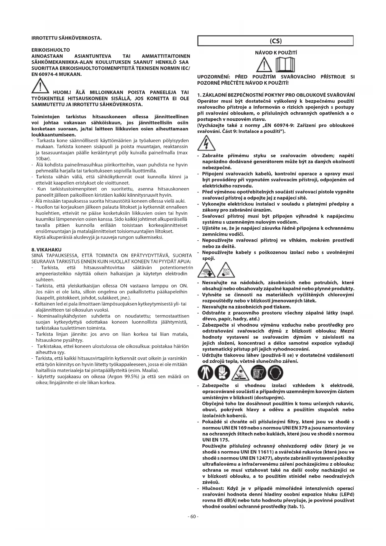 - OPERACE SVAŘOVÁNÍ: - V prostředí se zvýšeným rizikem zásahu elektrickým proudem; - ve vymezených prostorech; - v přítomnosti zápalných nebo výbušných materiálů MUSÍ být předem zhodnoceny „Odborným vedoucím“ a vykonány pokaždé v přítomnosti osob vyškolených pro zásahy v nouzových případech. MUSÍ být přijaty technické ochranné prostředky popsané v7.10; A.8; A.10 normy „EN 60974-9: Zařízení pro obloukové svařování. Část 9: Instalace a použití“. - MUSÍ být zakázáno svařování operátorem zvednutým ze země, s výjimkou použití bezpečnostních plošin. - NAPĚTÍ MEZI DRŽÁKY ELEKTROD NEBO SVAŘOVACÍMI PISTOLEMI: Při práci s více svařovacími přístroji na jediném svařovaném kusu nebo na více kusech spojených elektricky může dojít k nebezpečnému součtu napětí mezi dvěma odlišnými držáky elektrod nebo se svařovacími pistolemi, s hodnotou, která může dosáhnout dvojnásobku přípustné meze. Je potřebné, aby odborník – koordinátor provedl měření přístroji, čímž se zjistí, zda existuje nebezpečí rizika, a mohla se přijmout vhodná ochranná opatření v souladu s ustanovením části 7.9 normy „EN 60974-9: Zařízení pro obloukové svařování. Část 9: Instalace a použití“. ZBYTKOVÁ RIZIKA - NESPRÁVNÉ POUŽITÍ: Použití svařovacího přístroje na jakékoli jiné použití než je správné použití, (např. rozmrazování potrubí vodovodního rozvodu), je nebezpečné. - Je zakázáno používat rukojeť jako prostředek k zavěšení svařovacího přístroje.
