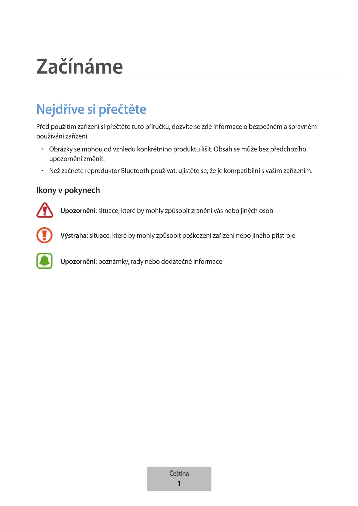 Než začnete reproduktor Bluetooth používat, ujistěte se, že je kompatibilní svaším zařízením. Ikony v pokynech Upozornění: situace, které by mohly způsobit zranění vás nebo jiných osob Výstraha: situace, které by mohly způsobit poškození zařízení nebo jiného přístroje Upozornění: poznámky, rady nebo dodatečné informace Čeština 1Začínáme