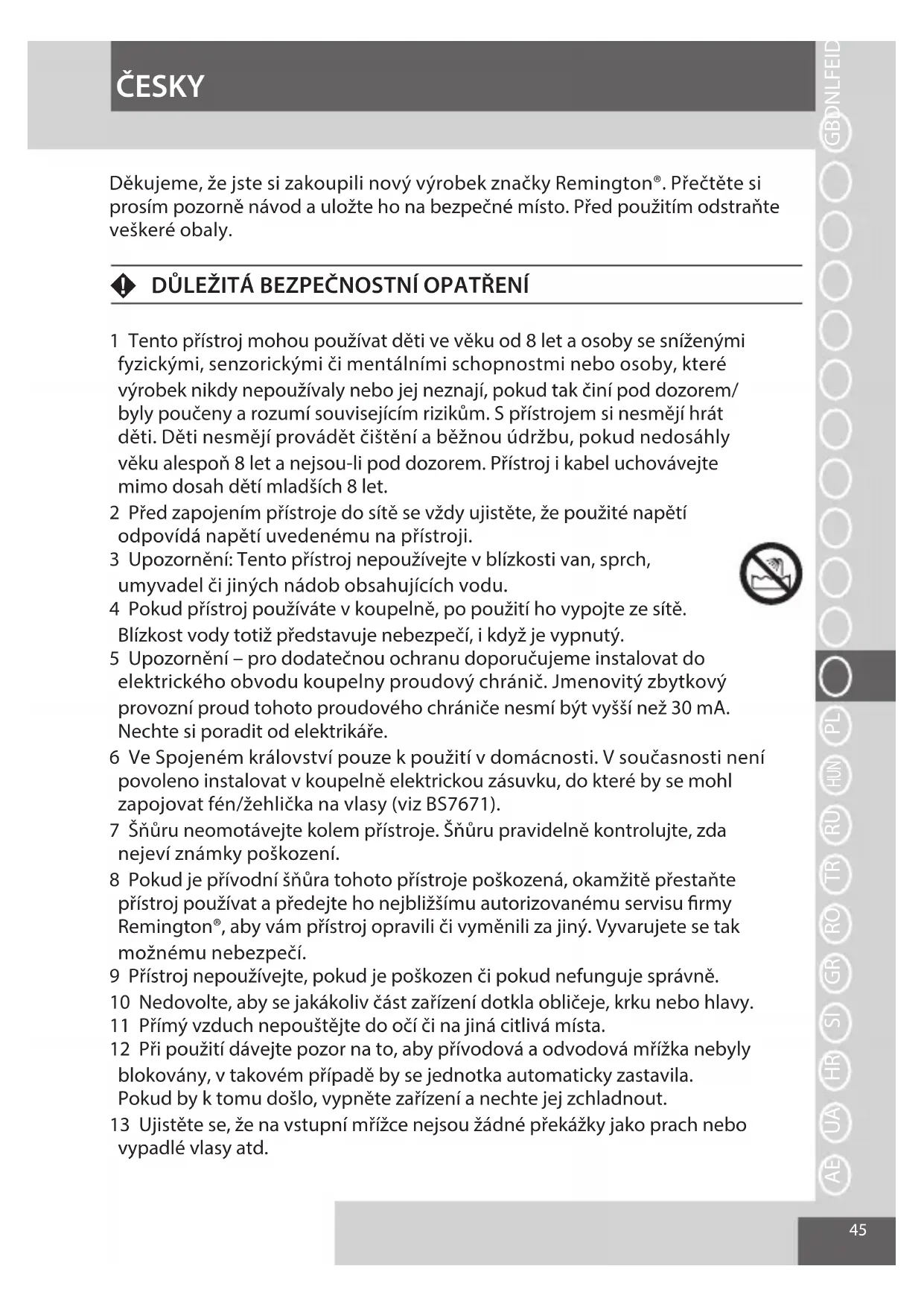 8 Pokud je přívodní šňůra tohoto přístroje poškozená, okamžitě přestaňte přístroj používat a předejte ho nejbližšímu autorizovanému servisu firmy Remington®, aby vám přístroj opravili či vyměnili za jiný. Vyvarujete se tak možnému nebezpečí.