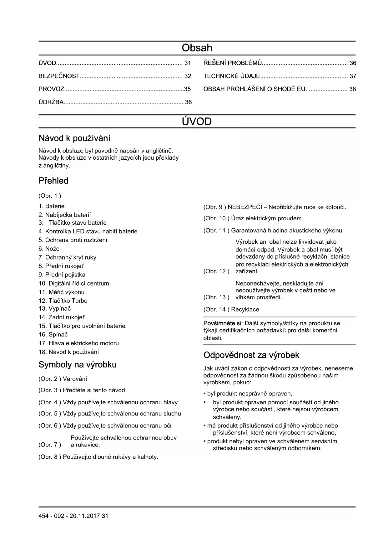 - Během přepravy a skladování výrobku musí být nasazený přepravní kryt nože. 34 454 - 002 - 20.11.2017Bezpečnostní pokyny pro údržbu VÝSTRAHA: Nesprávná údržba může mít za následek poškození motoru nebo zranění. Obsluha výrobku je odpovědná za provádění veškeré nezbytné údržby tak, jak je stanovena v návodu k používání. Před prováděním údržby vyjměte baterii. PROVOZ VÝSTRAHA: Než začnete s výrobkem pracovat, přečtěte si důkladně kapitolu o bezpečnosti. Před spuštěním výrobku
