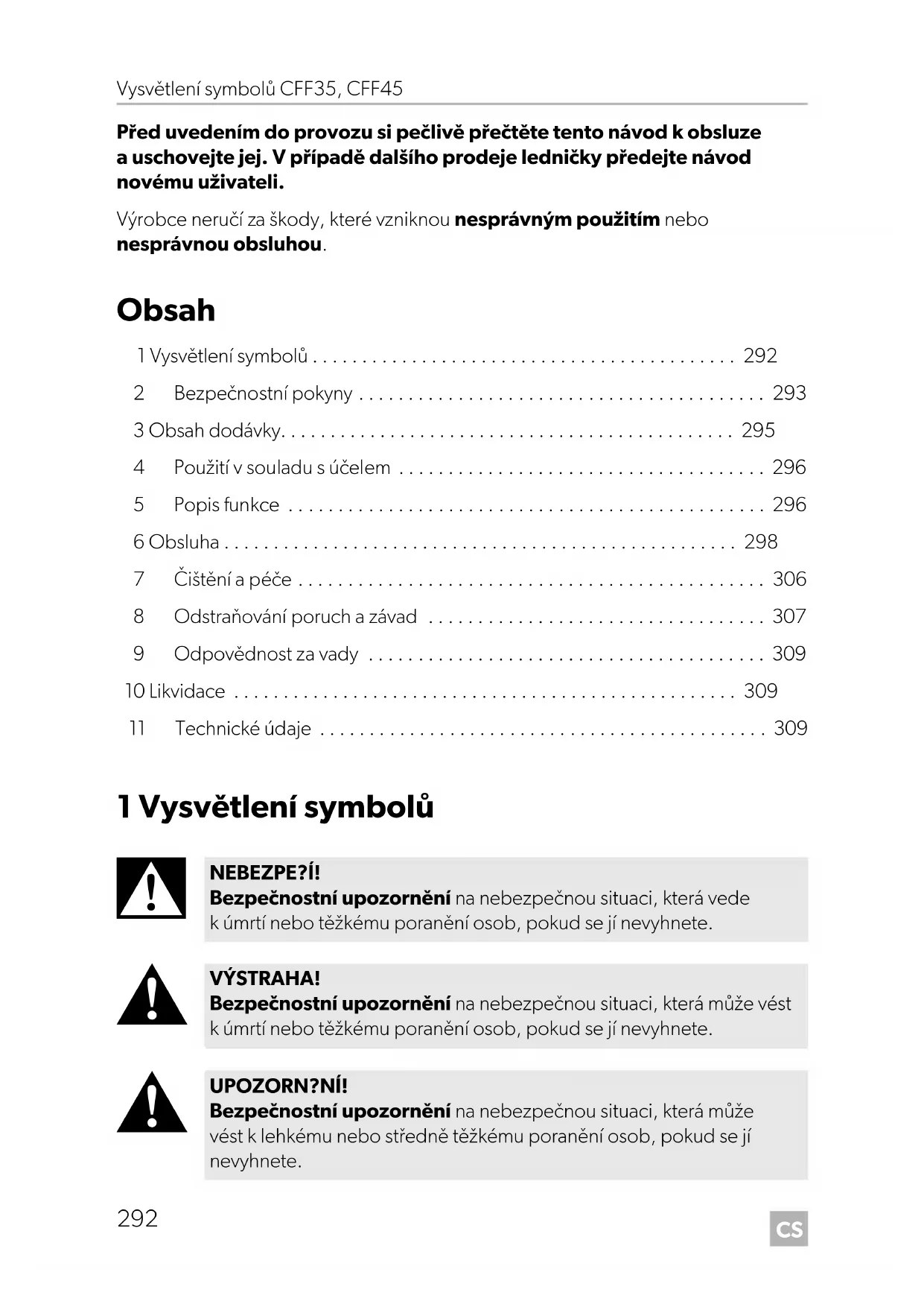 - Před uvedením do provozu si pečlivě přečtěte tento návod k obsluze a uschovejte jej. V případě dalšího prodeje ledničky předejte návod novému uživateli. Výrobce neručí za škody, které vzniknou nesprávným použitím nebo nesprávnou obsluhou. Obsah 1 Vysvětlení symbolů p. 292