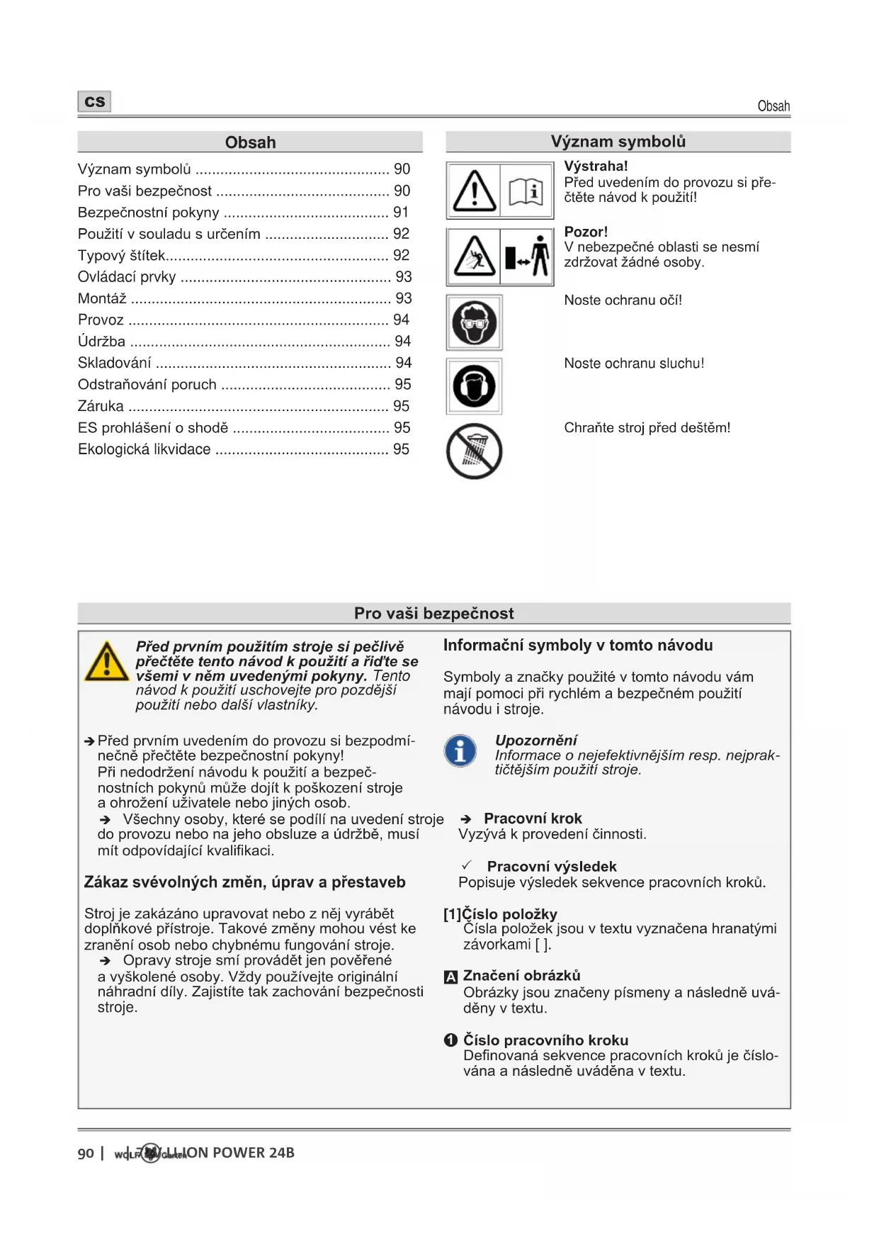 - Ekologická likvidace Provašibezpečnost Významsymbolů Výstraha! Před uvedením do provozu si pře- čtěte návod k použití! Pozor! V nebezpečné oblasti se nesmí zdržovat žádné osoby. Noste ochranu očí! Noste ochranu sluchu! Chraňte stroj před deštěm!Bezpečnostní pokyny p. 95