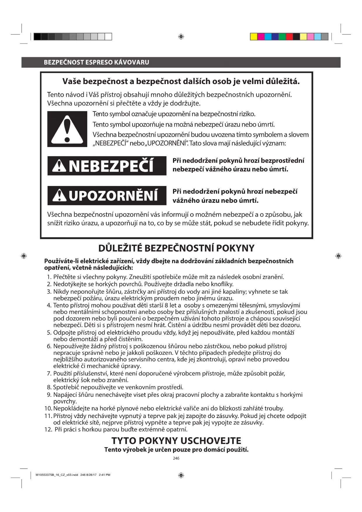 Tento výrobek je určen pouze pro domácí použití. Vaše bezpečnost a bezpečnost dalších osob je velmi důležitá. Tento návod i Váš přístroj obsahují mnoho důležitých bezpečnostních upozornění. Všechna upozornění si přečtěte a vždy je dodržujte. Tento symbol označuje upozornění na bezpečnostní riziko. Tento symbol upozorňuje na možná nebezpečí úrazu nebo úmrtí. Všechna bezpečnostní upozornění budou uvozena tímto symbolem a slovem „NEBEZPEČÍ“ nebo „UPOZORNĚNÍ”. Tato slova mají následující význam: Při nedodržení pokynů hrozí bezprostřední nebezpečí vážného úrazu nebo úmrtí. Při nedodržení pokynů hrozí nebezpečí vážného úrazu nebo úmrtí. Všechna bezpečnostní upozornění vás informují o možném nebezpečí a o způsobu, jak snížit riziko úrazu, a upozorňují na to, co by se může stát, pokud se nebudete řídit pokyny. NEBEZPEČÍ UPOZORNĚNÍ