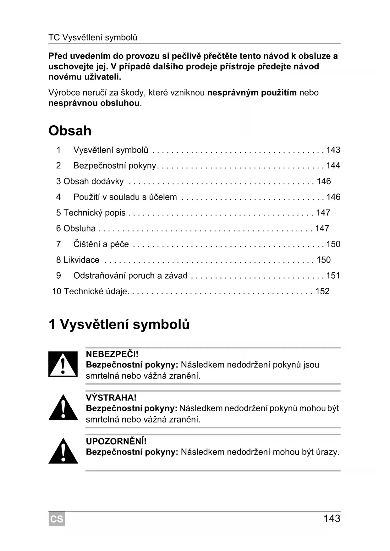 - Před uvedením do provozu si pečlivě přečtěte tento návod k obsluze a uschovejte jej. V případě dalšího prodeje přístroje předejte návod novému uživateli. Výrobce neručí za škody, které vzniknou nesprávným použitím nebo nesprávnou obsluhou. Obsah 1 Vysvětlení symbolů p. 143