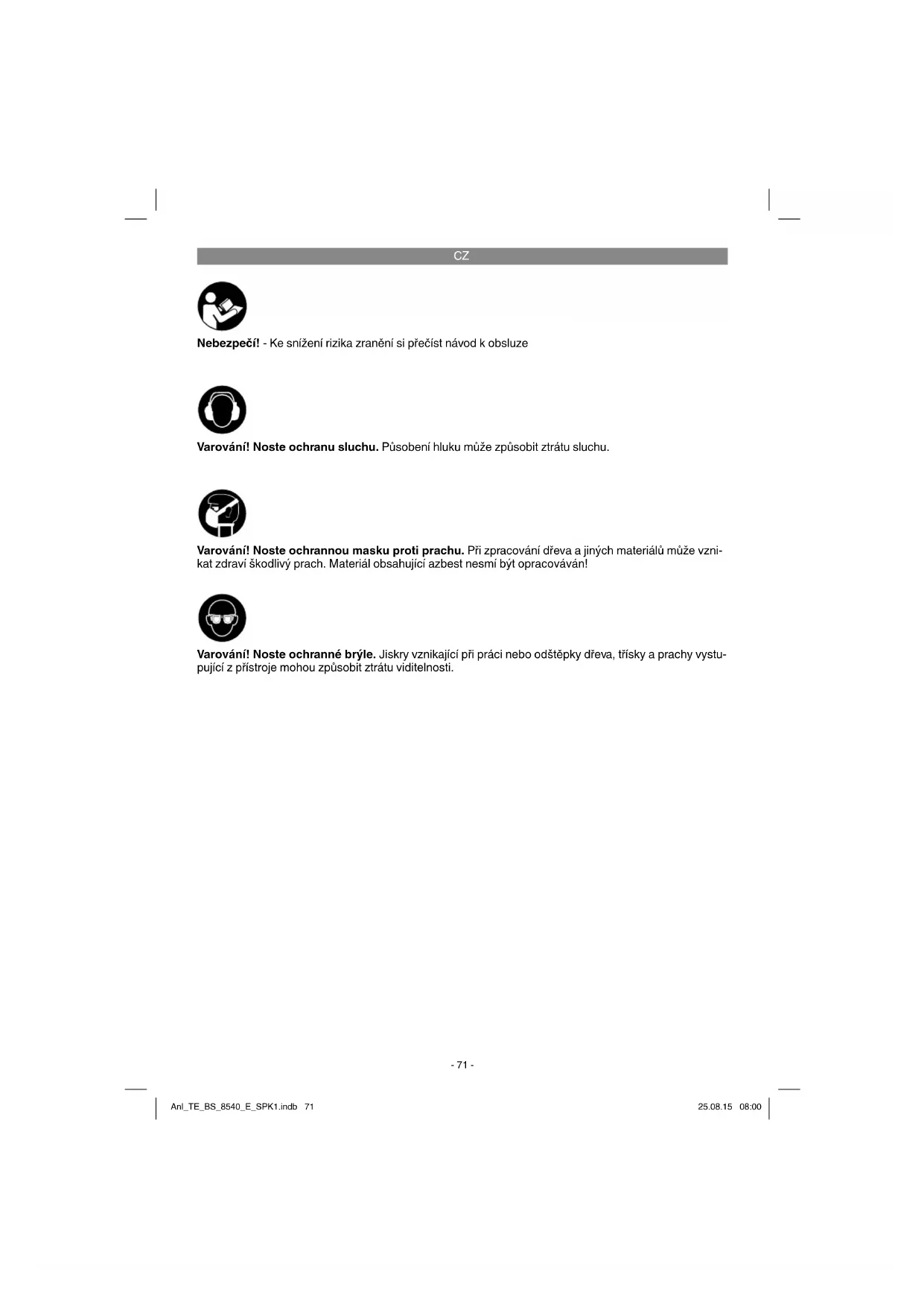 Nebezpečí! - Ke snížení rizika zranění si přečíst návod k obsluze Varování! Noste ochranu sluchu. Působení hluku může způsobit ztrátu sluchu. Varování! Noste ochranné brýle. Jiskry vznikající při práci nebo odštěpky dřeva, třísky a prachy vystu- pující z přístroje mohou způsobit ztrátu viditelnosti. Varování! Noste ochrannou masku proti prachu. Při zpracování dřeva a jiných materiálů může vzni- kat zdraví škodlivý prach. Materiál obsahující azbest nesmí být opracováván! Anl_TE_BS_8540_E_SPK1.indb 71Anl_TE_BS_8540_E_SPK1.indb 71 25.08.15 08:0025.08.15 08:00CZ