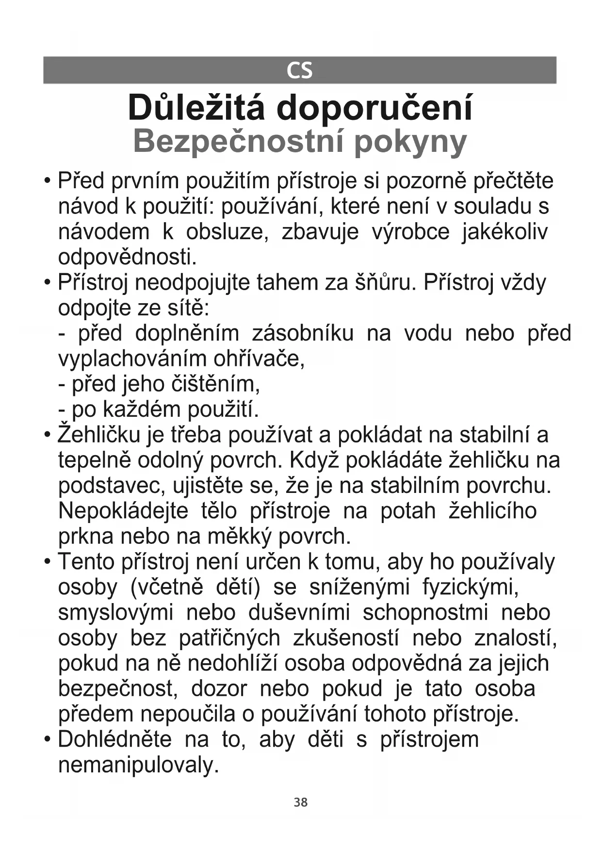 - Před prvním použitím přístroje si pozorně přečtěte návod k použití: používání, které není v souladu s návodem k obsluze, zbavuje výrobce jakékoliv odpovědnosti.