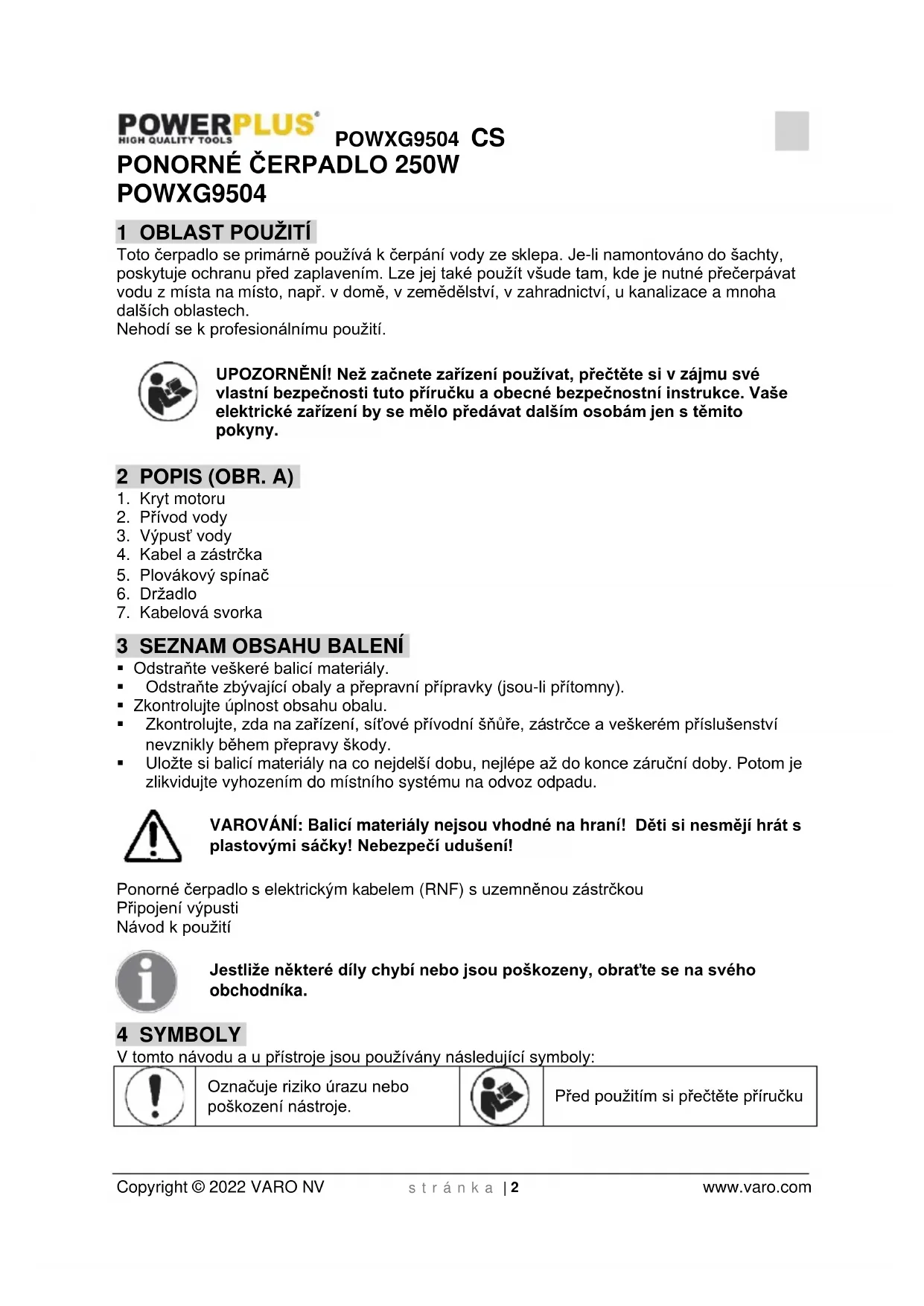 Použité zařízení nelikvidujte spolu s běžným domovním odpadem, ale řiďte se předpisy vydanými s ohledem na ochranu životního prostředí. Použitý motorový olej likvidujte způsobem slučitelným s péčí o životní prostředí. V kanystru jej předejte k recyklaci do vyhrazeného střediska pro likvidaci tohoto druhu odpadu. Nevyhazujte jej do odpadu ani jej nevylévejte na zem.POWXG9504 CS Copyright © 2022 VARO NV s t r á n k a | 8 www.varo.com