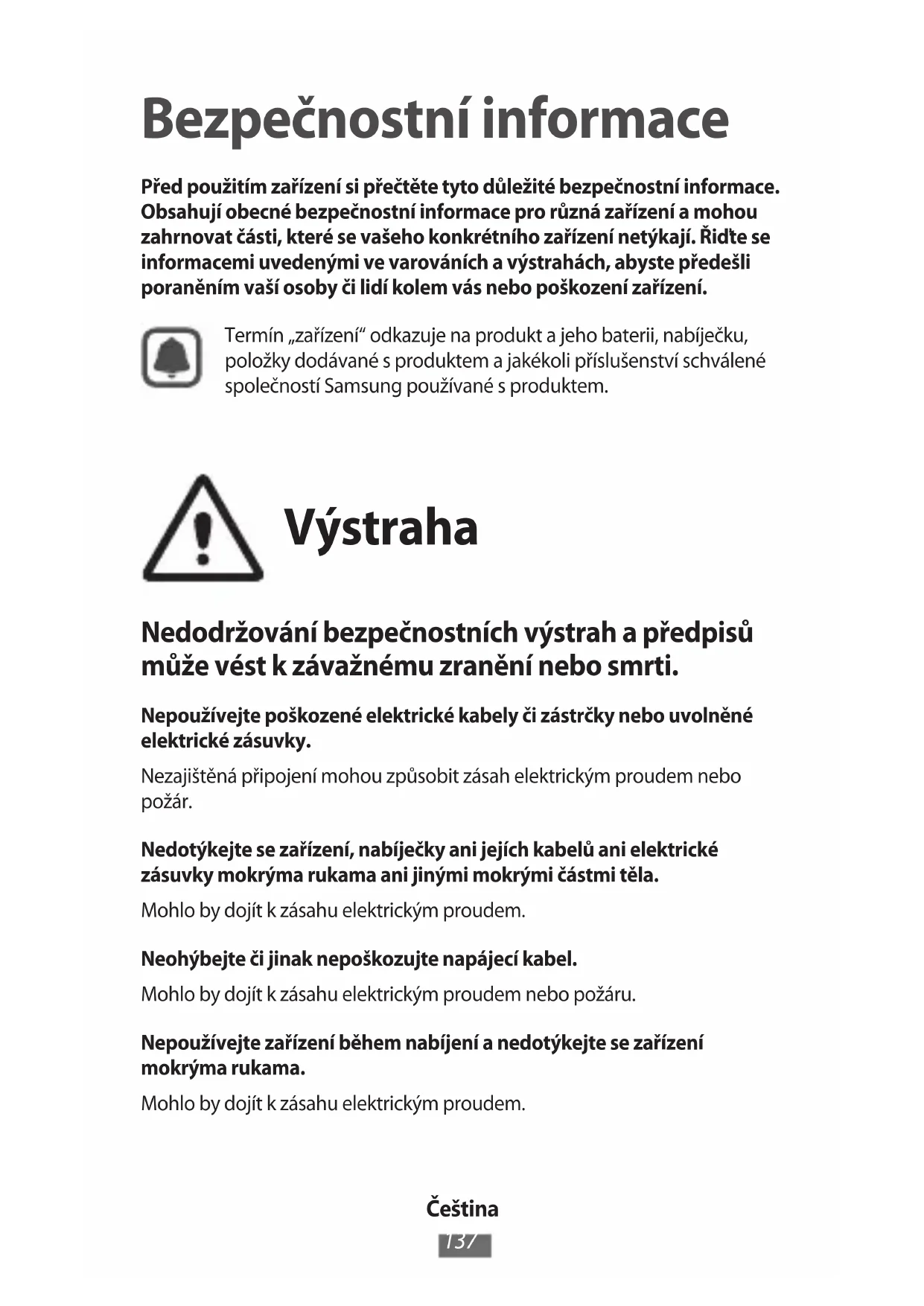 Bezpečnostní informace Před použitím zařízení si přečtěte tyto důležité bezpečnostní informace. Obsahují obecné bezpečnostní informace pro různá zařízení a mohou zahrnovat části, které se vašeho konkrétního zařízení netýkají. Řiďte se informacemi uvedenými ve varováních a výstrahách, abyste předešli poraněním vaší osoby či lidí kolem vás nebo poškození zařízení.Termín „zařízení“ odkazuje na produkt a jeho baterii, nabíječku, položky dodávané s produktem a jakékoli příslušenství schválené společností Samsung používané s produktem. Výstraha Nedodržování bezpečnostních výstrah a předpisů může vést k závažnému zranění nebo smrti. Nepoužívejte poškozené elektrické kabely či zástrčky nebo uvolněné elektrické zásuvky.Nezajištěná připojení mohou způsobit zásah elektrickým proudem nebo požár.Nedotýkejte se zařízení, nabíječky ani jejích kabelů ani elektrické zásuvky mokrýma rukama ani jinými mokrými částmi těla.Mohlo by dojít k zásahu elektrickým proudem.Neohýbejte či jinak nepoškozujte napájecí kabel.Mohlo by dojít k zásahu elektrickým proudem nebo požáru.Nepoužívejte zařízení během nabíjení a nedotýkejte se zařízení mokrýma rukama.Mohlo by dojít k zásahu elektrickým proudem.Čeština