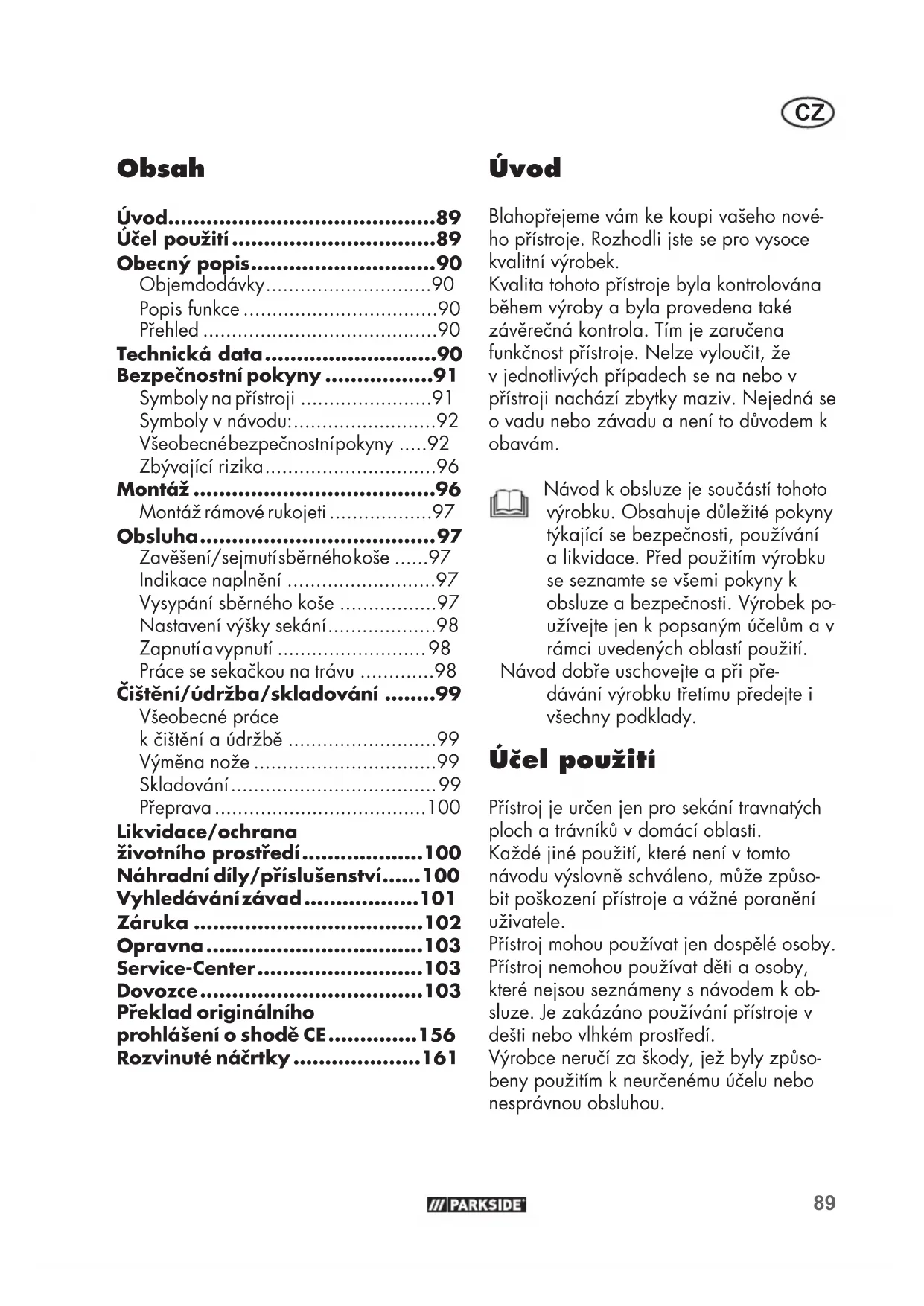- Úvod Blahopřejeme vám ke koupi vašeho nové- ho přístroje. Rozhodli jste se pro vysoce kvalitní výrobek. Kvalita tohoto přístroje byla kontrolována během výroby a byla provedena také závěrečná kontrola. Tím je zaručena funkčnost přístroje. Nelze vyloučit, že v jednotlivých případech se na nebo v přístroji nachází zbytky maziv. Nejedná se o vadu nebo závadu a není to důvodem k obavám. Návod k obsluze je součástí tohoto výrobku. Obsahuje důležité pokyny týkající se bezpečnosti, používání a likvidace. Před použitím výrobku se seznamte se všemi pokyny k obsluze a bezpečnosti. Výrobek po- užívejte jen k popsaným účelům a v rámci uvedených oblastí použití. Návod dobře uschovejte a při pře- dávání výrobku třetímu předejte i všechny podklady. Účel použití Přístroj je určen jen pro sekání travnatých ploch a trávníků v domácí oblasti. Každé jiné použití, které není v tomto návodu výslovně schváleno, může způso- bit poškození přístroje a vážné poranění uživatele. Přístroj mohou používat jen dospělé osoby. Přístroj nemohou používat děti a osoby, které nejsou seznámeny s návodem k ob- sluze. Je zakázáno používání přístroje v dešti nebo vlhkém prostředí. Výrobce neručí za škody, jež byly způso- beny použitím k neurčenému účelu nebo nesprávnou obsluhou. Obsah Úvod p. 89