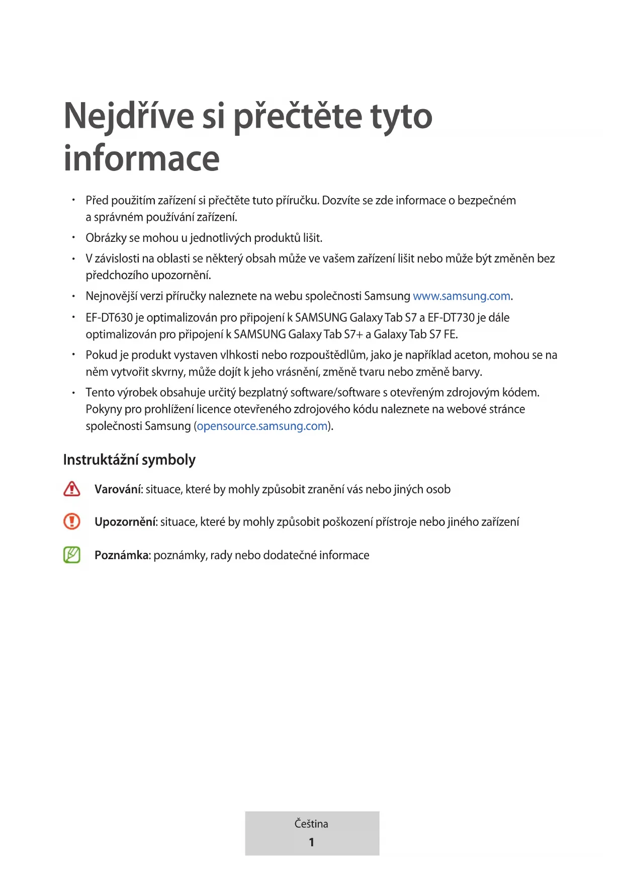 Tento výrobek obsahuje určitý bezplatný software/software s otevřeným zdrojovým kódem. Pokyny pro prohlížení licence otevřeného zdrojového kódu naleznete na webové stránce společnosti Samsung (opensource.samsung.com). Instruktážní symboly Varování: situace, které by mohly způsobit zranění vás nebo jiných osob Upozornění: situace, které by mohly způsobit poškození přístroje nebo jiného zařízení Poznámka: poznámky, rady nebo dodatečné informace2