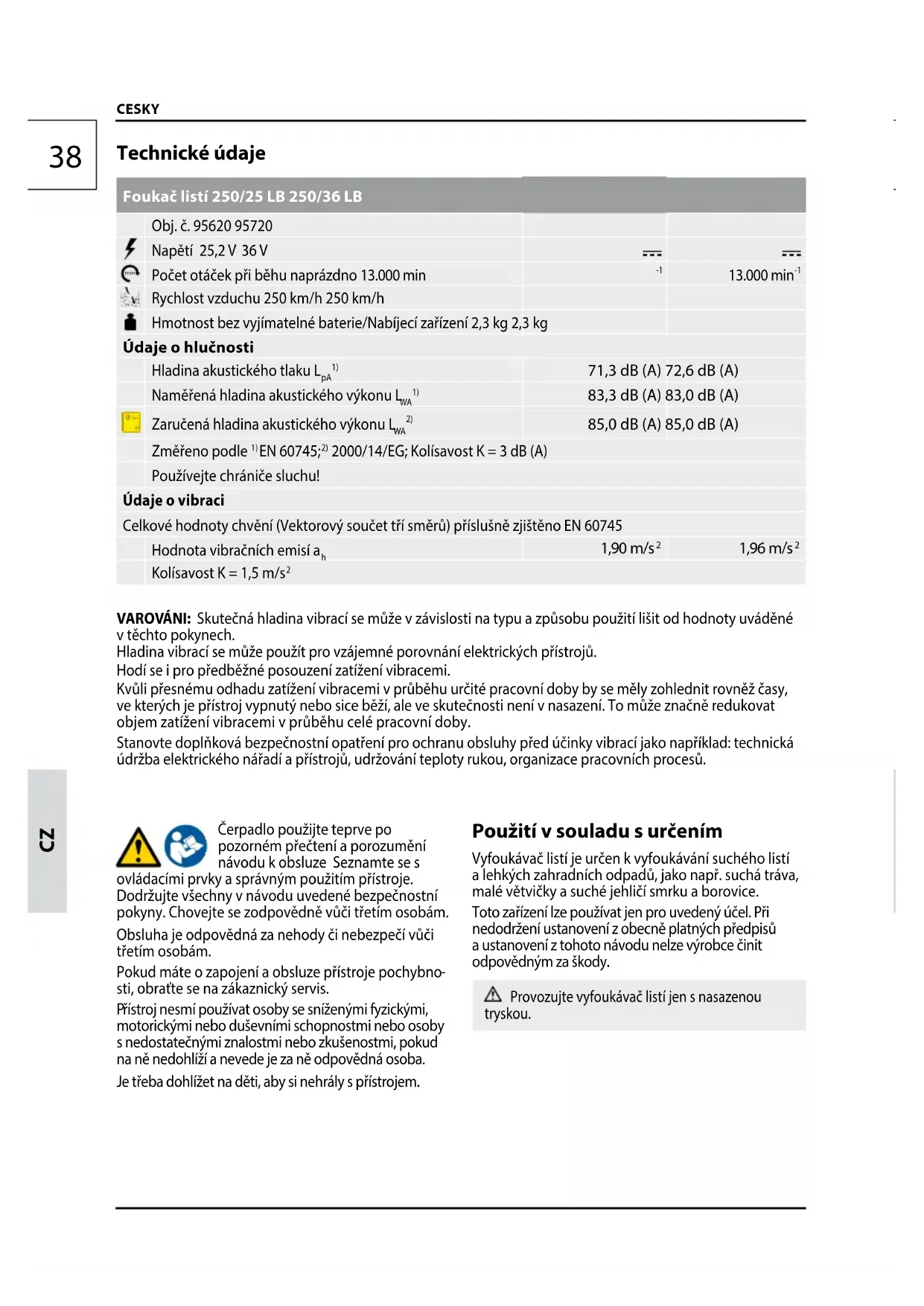 řístroj nesmí používat osoby se sníženými fyzickými, motorickými nebo duševními schopnostmi nebo osoby s nedostatečnými znalostmi nebo zkušenostmi, pokud na ně nedohlíží a nevede je za ně odpovědná osoba. Je třeba dohlížet na děti, aby si nehrály spřístrojem. Použití v souladu s určením Vyfoukávač listí je určen k vyfoukávání suchého listí a lehkých zahradních odpadů, jako např. suchá tráva, malé větvičky a suché jehličí smrku a borovice. Toto zařízení lze používat jen pro uvedený účel. Při nedodržení ustanovení z obecně platných předpisů a ustanovení z tohoto návodu nelze výrobce činit odpovědným za škody. Provozujte vyfoukávač listí jen s nasazenou tryskou. Technické údaje Foukač listí 250/25 LB 250/36 LB Obj. č. 95620 95720 Napětí 25,2 V 36 V min Počet otáček při běhu naprázdno 13.000 min