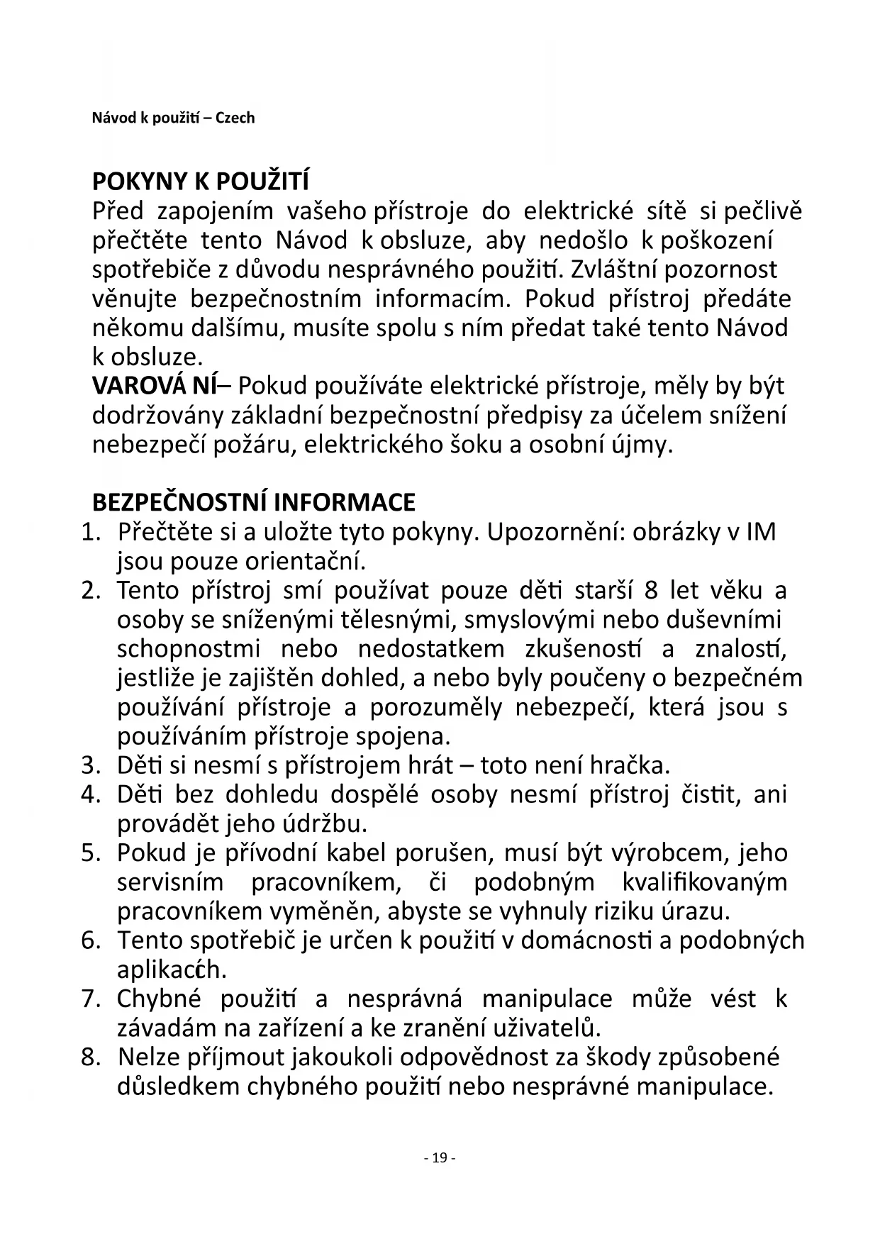 Před zapojením vašeho přístroje do elektrické sítě si pečlivě přečtěte tento Návod k obsluze, aby nedošlo k poškození spotřebiče z důvodu nesprávného použití. Zvláštní pozornost věnujte bezpečnostním informacím. Pokud přístroj předáte někomu dalšímu, musíte spolu s ním předat také tento Návod k obsluze. VAROVÁNÍ – Pokud používáte elektrické přístroje, měly by být dodržovány základní bezpečnostní předpisy za účelem snížení nebezpečí požáru, elektrického šoku a osobní újmy.