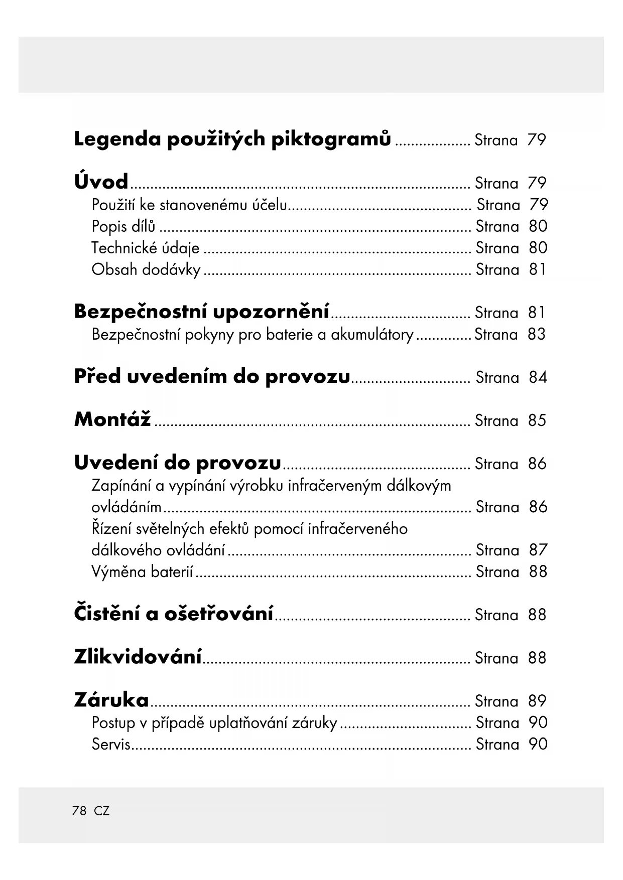 Při třídění odpadu se řiďte podle označení obalových materiálů zkratkami (a) a čísly (b), s násle- dujícím významem: 1–7: umělé hmoty / 20–22: papír a lepenka / 80–98: složené látky. Výrobek a obalové materiály jsou recyklo- vatelné, zlikvidujte je odděleně pro lepší odstranění odpadu. Logo Triman platí jen pro Francii. O možnostech likvidace vysloužilých zařízení se informujte u správy vaší obce nebo města. Vzájmu ochrany život- ního prostředí vysloužilý výrobek nevyhazujte89 CZ do domovního odpadu, ale pře- dejte k odborné likvidaci. O sběr- nách a jejich otevíracích hodinách se můžete informovat u příslušné správy města nebo obce. Vadné nebo vybité baterie resp. akumulátory se musí, podle směr- nice 2006/66/ES a jejích přísluš- ných změn, recyklovat. Baterie, akumulátory i výrobek odevzdejte zpět do nabízených sběren. Ekologické škody v důsledku chybné likvidace baterií / akumulátorů! Baterie / akumulátory se nesmí zlikvidovat v domácím odpadu. Mohou obsahovat jedovaté těžké kovy a musí se zpracovávat jako zvláštní odpad. Chemické symboly těžkých kovů: Cd = kadmium, Hg = rtuť, Pb = olovo. Proto ode- vzdejte opotřebované baterie / akumulátory u komunální sběrny. Záruka Výrobek byl vyroben s nejvyšší pečlivostí podle přísných kvalita- tivních směrnic a před odesláním
