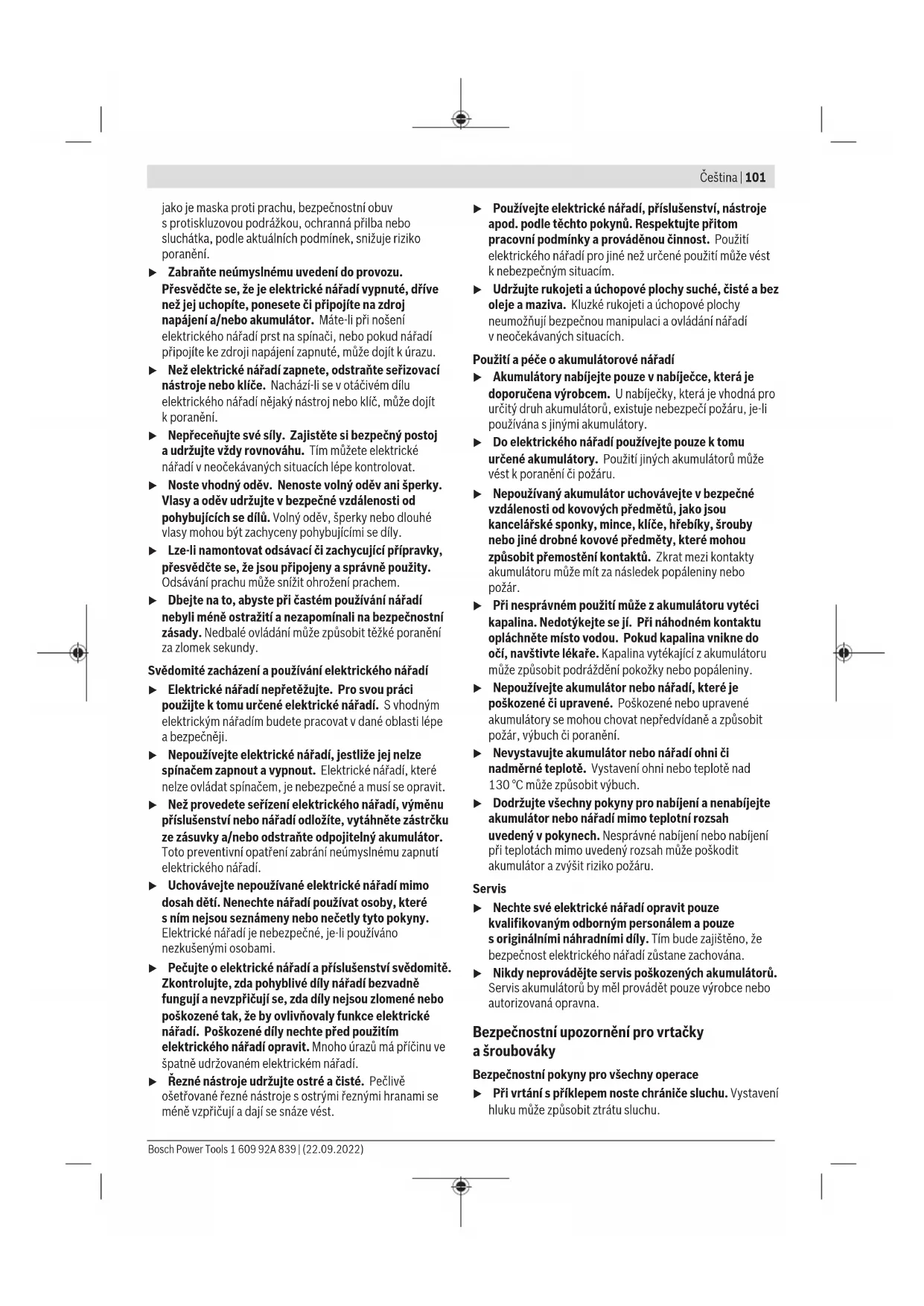 12,0 1,5 Úroveň vibrací aúroveň hluku, které jsou uvedené vtěchto pokynech, byly změřeny pomocí normované měřicí metody alze je použít pro vzájemné porovnání elektronářadí. Hodí se ipro předběžný odhad zatížení vibracemi ahlukem. Uvedená úroveň vibrací aúroveň hluku reprezentuje hlavní použití elektronářadí. Pokud se ovšem bude elektronářadí používat pro jiné práce, sjinými nástroji nebo snedostatečnou údržbou, může se úroveň hluku aúroveň vibrací lišit. To může zatížení vibracemi ahlukem po celou pracovní dobu zřetelně zvýšit. Pro přesný odhad zatížení vibracemi ahlukem by měly být zohledněny idoby, kdy je nářadí vypnuté nebo běží, ale ve Bosch Power Tools 1 609 92A 839 | (22.09.2022)104 | Čeština skutečnosti se nepoužívá. To může zatížení vibracemi ahlukem po celou pracovní dobu výrazně snížit. Stanovte dodatečná bezpečnostní opatření kochraně obsluhy před účinky vibrací, jako je např. údržba elektronářadí anástrojů, udržování teplých rukou, organizace pracovních procesů. Montáž u Před každou prací na elektronářadí (např. údržba, výměna nástrojů) apři jeho přepravě auskladnění vyjměte akumulátor. Při neúmyslném stisknutí vypínače hrozí nebezpečí poranění. Nabíjení akumulátoru u Používejte pouze nabíječky uvedené vtechnických údajích. Jen tyto nabíječky jsou přizpůsobené pro lithium-iontový akumulátor používaný svaším elektronářadím. Upozornění: Akumulátor se dodává částečně nabitý. Aby byl zaručen plný výkon akumulátoru, před prvním použitím akumulátor úplně nabijte vnabíječce. Lithium-iontový akumulátor lze nabíjet kdykoli, aniž by se tím zkrátila životnost. Přerušení procesu nabíjení nepoškozuje akumulátor. Lithium-iontový akumulátor je díky „Electronic Cell Protection (ECP)“ chráněný proti hlubokému vybití. Při vybitém akumulátoru ochranná funkce vypne elektrické nářadí: Nástroj se již nepohybuje. u Po automatickém vypnutí elektronářadí už nestiskávejte vypínač. Akumulátor se může poškodit. Dodržujte pokyny pro likvidaci. Vyjmutí akumulátoru Akumulátor (6) je opatřený dvěma stupni zajištění, které mají zabránit vypadnutí akumulátoru při neúmyslném stisknutí odjišťovacího tlačítka (7). Pokud je akumulátor nasazený do elektronářadí, je držen ve své poloze pružinou. Pro vyjmutí akumulátoru (6) stiskněte odjišťovací tlačítko (7) aakumulátor vytáhněte zelektronářadí. Nepoužívejte přitom násilí. Ukazatel stavu nabití akumulátoru Zelené LED ukazatele stavu nabití akumulátoru indikují stav nabití akumulátoru. Zbezpečnostních důvodů je zjištění stavu nabití možné pouze při vypnutém elektronářadí. Pro zobrazení stavu nabití stiskněte tlačítko ukazatele stavu nabití nebo . Je to možné také při vyjmutém akumulátoru. Pokud po stisknutí tlačítka ukazatele stavu nabití nesvítí žádná LED, je akumulátor vadný amusí se vyměnit. Typ akumulátoru GBA 18V... LED Kapacita Trvale svítí tři zelené 60−100% Trvale svítí dvě zelené 30−60% Trvale svítí jedna zelená 5−30% Bliká jedna zelená 0−5% Typ akumulátoru ProCORE18V... LED Kapacita Trvale svítí pět zelených 80−100 % Trvale svítí čtyři zelené 60−80 % Trvale svítí tři zelené 40−60 % Trvale svítí dvě zelené 20−40 % Trvale svítí jedna zelená 5−20 % Bliká jedna zelená 0−5 % Výměna nástroje (viz obrázekA) u Před každou prací na elektronářadí (např. údržba, výměna nástrojů) apři jeho přepravě auskladnění vyjměte akumulátor. Při neúmyslném stisknutí vypínače hrozí nebezpečí poranění. Otevřete rychloupínací sklíčidlo (2) otáčením ve směru➊ tak, aby bylo možné nasadit nástroj. Nasaďte nástroj. Ručně pevně utáhněte objímku rychloupínacího sklíčidla (2) ve směru➋ tak, aby již nebylo slyšet přecvakávání. Sklíčidlo se tím automaticky zajistí. Odsávání prachu/třísek Prach zmateriálů, jako jsou nátěry sobsahem olova, některé druhy dřeva, minerály akov, může být zdraví škodlivý. Kontakt sprachem či vdechnutí mohou vyvolat alergické reakce a/nebo onemocnění dýchacích cest obsluhy nebo vblízkosti se nacházejících osob. Určitý prach, jako dubový nebo bukový prach, je pokládán za karcinogenní, zvláště ve spojení spřídavnými látkami pro ošetření dřeva (chromát, ochranné prostředky na dřevo). Materiál obsahující azbest smějí opracovávat pouze specialisté. – Zajistěte dobré větrání pracoviště. – Je doporučeno nosit ochrannou dýchací masku střídou filtruP2. Dodržujte předpisy pro obráběné materiály platné vpříslušné zemi. u Zabraňte hromadění prachu na pracovišti. Prach se může lehce vznítit. 1 609 92A 839 | (22.09.2022) Bosch Power ToolsČeština | 105 Provoz Uvedení do provozu Nasazení akumulátoru Upozornění: Používání akumulátorů, které nejsou vhodné pro vaše elektronářadí, může vést knesprávným funkcím nebo kpoškození elektronářadí. Nastavte přepínač směru otáčení (10) doprostřed, abyste zabránili neúmyslnému zapnutí. Nabitý akumulátor (6) vložte do rukojeti, až citelně zapadne anebude zrukojeti vyčnívat. Nastavení směru otáčení (viz obrázek B) u Přepínač směru otáčení (10) používejte pouze tehdy, když je elektronářadí zastavené. Pomocí přepínače směru otáčení (10) můžete změnit směr otáčení elektronářadí. Při stisknutém vypínači (11) to ale není možné. Chod vpravo: Pro vrtání azašroubování šroubů stiskněte přepínač směru otáčení (10) až nadoraz doleva. Chod vlevo: Pro povolování, resp. vyšroubování šroubů amatic stiskněte přepínač směru otáčení (10) až na doraz doprava. Nastaven