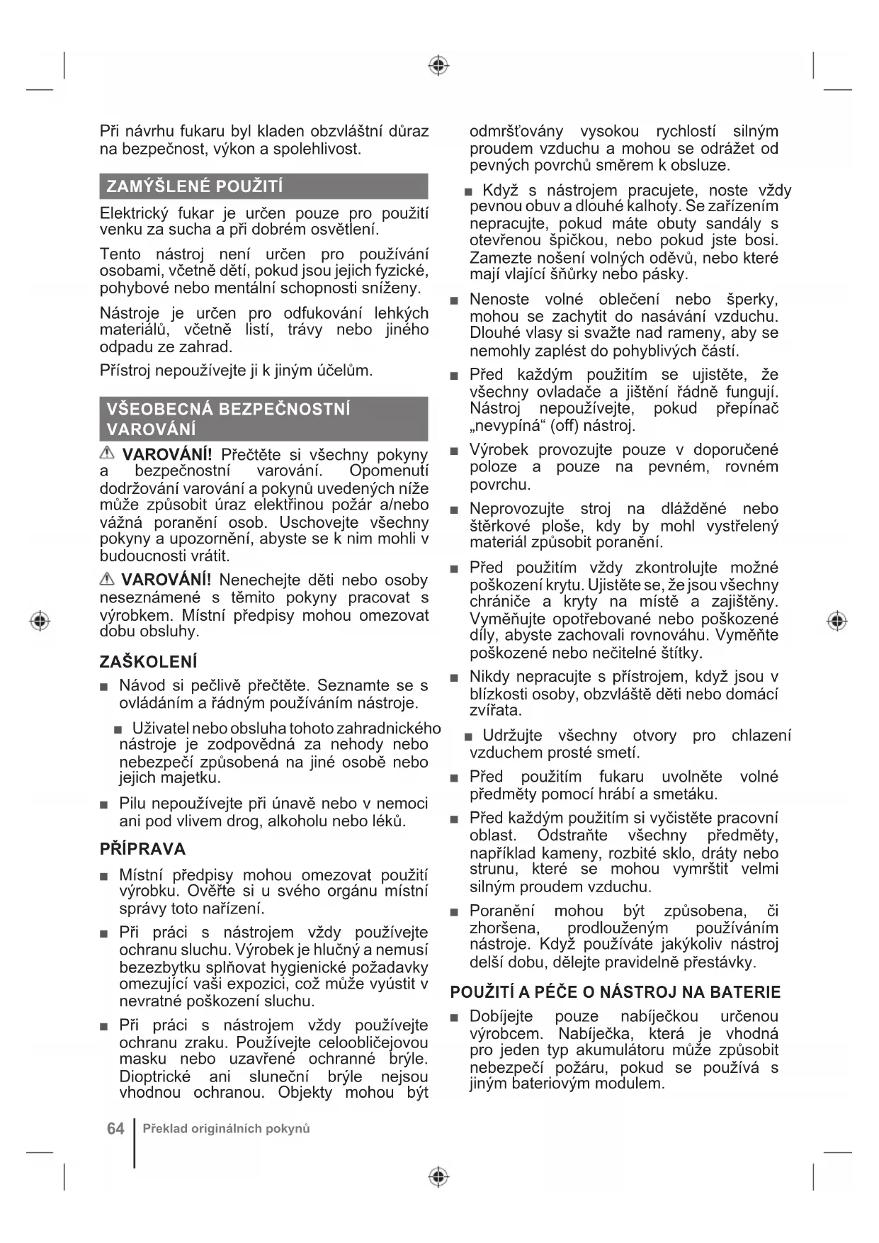VAROVÁNÍ VAROVÁNÍ! Přečtěte si všechny pokyny a bezpečnostní varování. Opomenutí dodržování varování a pokynů uvedených níže může způsobit úraz elektřinou požár a/nebo vážná poranění osob. Uschovejte všechny pokyny a upozornění, abyste se k nim mohli v budoucnosti vrátit. VAROVÁNÍ! Nenechejte děti nebo osoby neseznámené s těmito pokyny pracovat s výrobkem. Místní předpisy mohou omezovat dobu obsluhy. ZAŠKOLENÍ ■ Návod si pečlivě přečtěte. Seznamte se s ovládáním a řádným používáním nástroje. ■ Uživatel nebo obsluha tohoto zahradnického nástroje je zodpovědná za nehody nebo nebezpečí způsobená na jiné osobě nebo jejich majetku. ■ Pilu nepoužívejte při únavě nebo v nemoci ani pod vlivem drog, alkoholu nebo léků. PŘÍPRAVA ■ Místní předpisy mohou omezovat použití výrobku. Ověřte si u svého orgánu místní správy toto nařízení. ■ Při práci s nástrojem vždy používejte ochranu sluchu. Výrobek je hlučný a nemusí bezezbytku splňovat hygienické požadavky omezující vaši expozici, což může vyústit v nevratné poškození sluchu. ■ Při práci s nástrojem vždy používejte ochranu zraku. Používejte celoobličejovou masku nebo uzavřené ochranné brýle. Dioptrické ani sluneční brýle nejsou vhodnou ochranou. Objekty mohou být odmršťovány vysokou rychlostí silným proudem vzduchu a mohou se odrážet od pevných povrchů směrem k obsluze. ■ Když s nástrojem pracujete, noste vždy pevnou obuv a dlouhé kalhoty. Se zařízením nepracujte, pokud máte obuty sandály s otevřenou špičkou, nebo pokud jste bosi. Zamezte nošení volných oděvů, nebo které mají vlající šňůrky nebo pásky. ■ Nenoste volné oblečení nebo šperky, mohou se zachytit do nasávání vzduchu. Dlouhé vlasy si svažte nad rameny, aby se nemohly zaplést do pohyblivých částí. ■ Před každým použitím se ujistěte, že všechny ovladače a jištění řádně fungují. Nástroj nepoužívejte, pokud přepínač „nevypíná“ (off) nástroj. ■ Výrobek provozujte pouze v doporučené poloze a pouze na pevném, rovném povrchu. ■ Neprovozujte stroj na dlážděné nebo štěrkové ploše, kdy by mohl vystřelený materiál způsobit poranění. ■ Před použitím vždy zkontrolujte možné poškození krytu. Ujistěte se, že jsou všechny chrániče a kryty na místě a zajištěny. Vyměňujte opotřebované nebo poškozené díly, abyste zachovali rovnováhu. Vyměňte poškozené nebo nečitelné štítky. ■ Nikdy nepracujte s přístrojem, když jsou v blízkosti osoby, obzvláště děti nebo domácí zvířata. ■ Udržujte všechny otvory pro chlazení vzduchem prosté smetí. ■ Před použitím fukaru uvolněte volné předměty pomocí hrábí a smetáku. ■ Před každým použitím si vyčistěte pracovní oblast. Odstraňte všechny předměty, například kameny, rozbité sklo, dráty nebo strunu, které se mohou vymrštit velmi silným proudem vzduchu. ■ Poranění mohou být způsobena, či zhoršena, prodlouženým používáním nástroje. Když používáte jakýkoliv nástroj delší dobu, dělejte pravidelně přestávky. POUŽITÍ A PÉČE O NÁSTROJ NA BATERIE ■ Dobíjejte pouze nabíječkou určenou výrobcem. Nabíječka, která je vhodná pro jeden typ akumulátoru může způsobit nebezpečí požáru, pokud se používá s jiným bateriovým modulem.ČEŠTINA