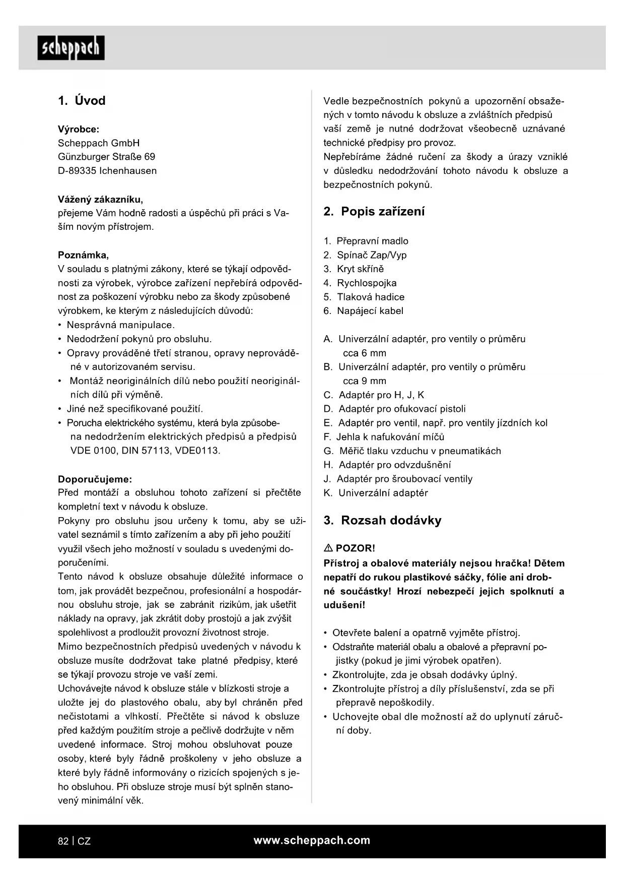 Výrobce: Scheppach GmbH Günzburger Straße 69 D-89335 Ichenhausen Vážený zákazníku, přejeme Vám hodně radosti a úspěchů při práci s Va- ším novým přístrojem. Poznámka, V souladu s platnými zákony, které se týkají odpověd- nosti za výrobek, výrobce zařízení nepřebírá odpověd- nost za poškození výrobku nebo za škody způsobené výrobkem, ke kterým z následujících důvodů: