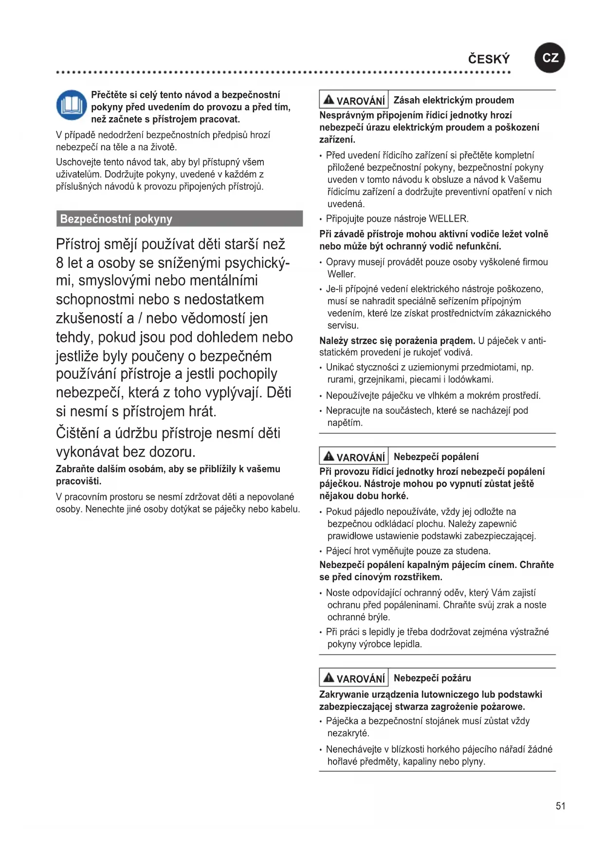 ČESKÝ52 Przechowywać lutownicę w bezpiecznym miejscu. Nepoužiténástrojeanářadíbymělybýtukládányna suchém,vysokopoloženémnebouzavřenémmístěmimo dosahdětí.Nepoužitépájecínástrojeodpojteodpřívodu elektrickéenergieastlačenéhovzduchu. Síťový kabel zapojujte jen do k tomu schvlených elektrických zstrček nebo adaptérů. Zkontrolujte,zda síťovénapětíodpovídáúdajinatypovémštítku.Přístroj připojujtedozásuvkypouzevevypnutémstavu. Nie stosować przewodu do celów, do których nie jest przeznaczony.Nikdynenostepřístrojzakabel.Nieużywać przewodudowyciąganiawtyczkizgniazda.Chronićprzewód przedwysokimitemperaturami,olejemiostrymi krawędziami. Zachować ostrożność. Věnujtepozornosttomu,coděláte. Připrácipostupujterozumně.Nieużywaćlutownicybez należytegoskupienia. Unikać nietypowej postawy ciała. Zaplanowaćswoje miejscepracyprawidłowopodwzględemergonomicznym. Připrácidbejtenasprávnédrženítěla.Nesprávnédržení tělamůžemítnegativnívlivnavašezdraví. Pječku je dovoleno uvést do provozu, pouze je-li v technicky bezvadném stavu.Ochrannéprvkysenesmějí vyřazovatzprovozu. Poruchy a zvady musejí být okamžitě odstraněny. Před každýmpoužitímpřístrojeástrojejetřebapečlivězkontro- lovatochrannéprvky,zdasprávněaurčenýmzpůsobem fungují.Přesvědčtese,žepohyblivédílybezvadněfungují, nikdesenesvírajíanejsoupoškozené.Veškerédílymusejí býtsprávněnamontoványasplňovatvšechnypodmínky,aby bylzaručenbezvadnýprovozpřístroje. Používejte sprvné nřadí. Používejtepouzepříslušenství nebonástavce,kteréjsouuvedenyvseznamupříslušenství nebojsouschválenyvýrobcem.Používejtepříslušenství WELLERnebonástavcepouzenaoriginálníchpřístrojích WELLER.Použitíjinýchnástrojůnebojinéhopříslušenství vámmůžezpůsobitzranění. Nřadí zajistěte.Používejteupínacíchprvkůproupnutí obrobku. Používejte odsvní pjecích výparů. Jsou-li k dispozici zařízenínapřipojeníodsávánípájecíchvýparů,přesvědčte se,žejsoutatozařízenípřipojenáapoužívanásprávným způsobem. Použití v souladu s určením NapájecíjednotkapropáječkyWELLER.Používejtepájecí stanicivýhradněkúčeluuvedenémuvnávodukprovozuk pájenízapodmínekvněmuvedených. Tentopřístrojlzepoužívatpouzepřipokojovýchteplotách avevnitřníchprostorách.Přístrojchraňtepředvlhkema přímýmslunečnímzářením.