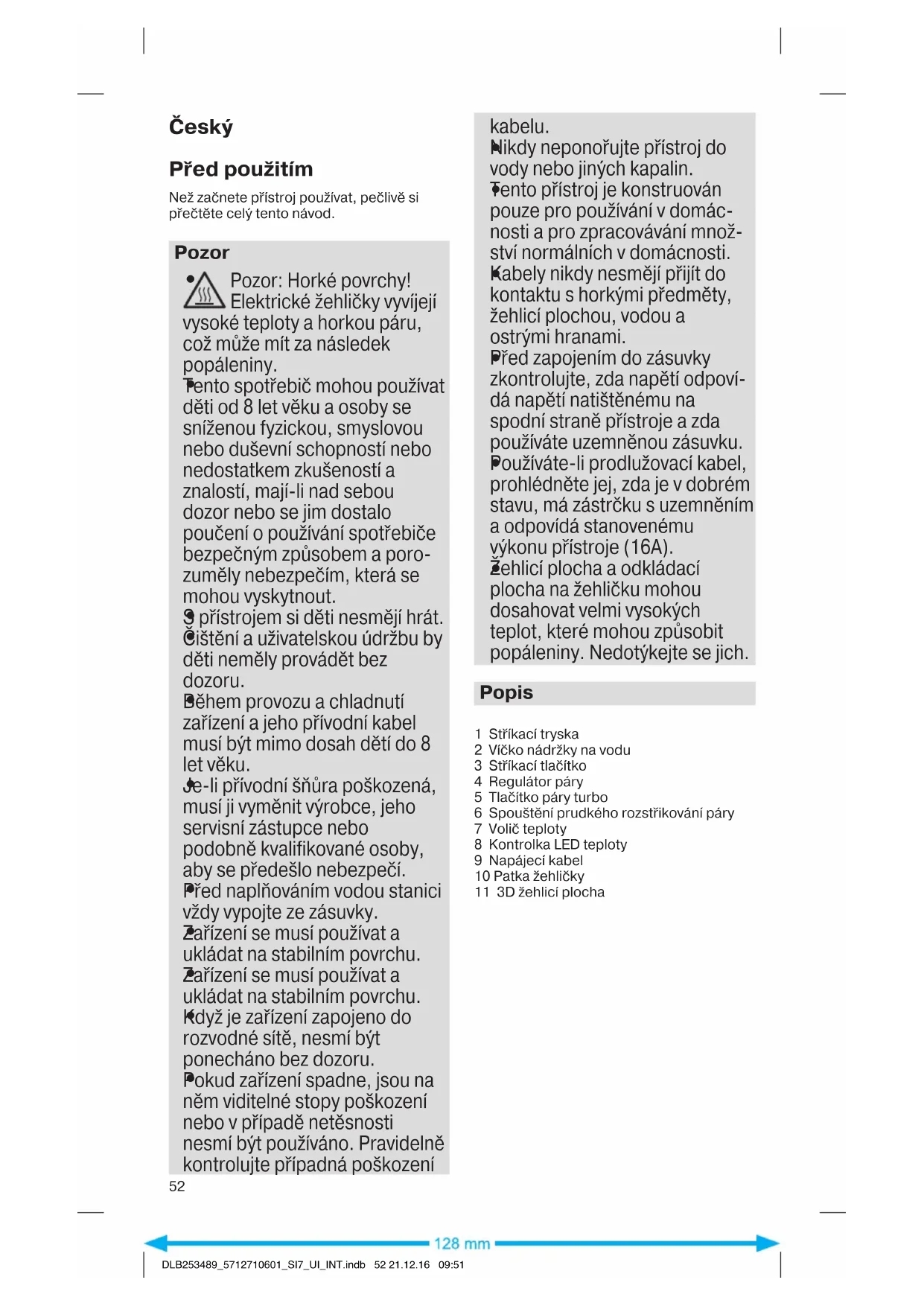 DLB253489_5712710601_SI7_UI_INT.indb 51 21.12.16 09:51Český Před použitím Než začnete přístroj používat, pečlivě si přečtěte celý tento návod. Pozor