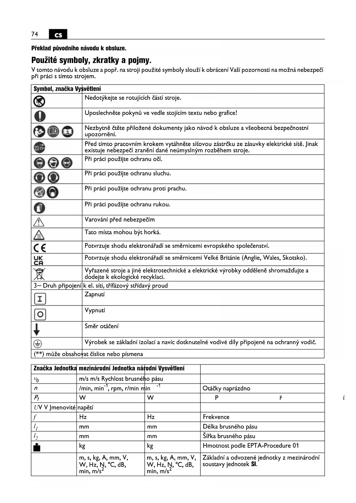 Překlad původního návodu k obsluze. Použité symboly, zkratky a pojmy. V tomto návodu k obsluze a popř. na stroji použité symboly slouží k obrácení Vaší pozornosti na možná nebezpečí při práci s tímto strojem. Symbol, značka Vysvětlení Nedotýkejte se rotujících částí stroje. Uposlechněte pokynů ve vedle stojícím textu nebo grafice! Nezbytně čtěte přiložené dokumenty jako návod k obsluze a všeobecná bezpečnostní upozornění. Před tímto pracovním krokem vytáhněte síťovou zástrčku ze zásuvky elektrické sítě. Jinak existuje nebezpečí zranění dané neúmyslným rozběhem stroje. Při práci použijte ochranu očí. Při práci použijte ochranu sluchu. Při práci použijte ochranu proti prachu. Při práci použijte ochranu rukou. Varování před nebezpečím Tato místa mohou být horká. Potvrzuje shodu elektronářadí se směrnicemi evropského společenství. Potvrzuje shodu elektronářadí se směrnicemi Velké Británie (Anglie, Wales, Skotsko). Vyřazené stroje a jiné elektrotechnické a elektrické výrobky odděleně shromažďujte a dodejte k ekologické recyklaci. 3~ Druh připojení k el. síti, třífázový střídavý proud Zapnutí Vypnutí Směr otáčení Výrobek se základní izolací a navíc dotknutelné vodivé díly připojené na ochranný vodič. (**) může obsahovat číslice nebo písmena Značka Jednotka mezinárodní Jednotka národní Vysvětlení