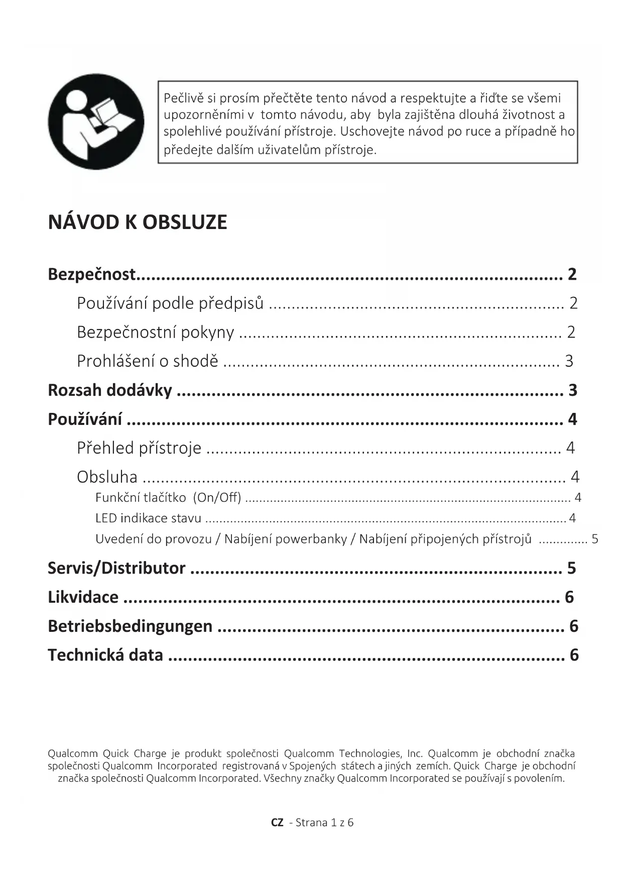 - Uvedení do provozu / Nabíjení powerbanky / Nabíjení připojených přístrojů p. 5