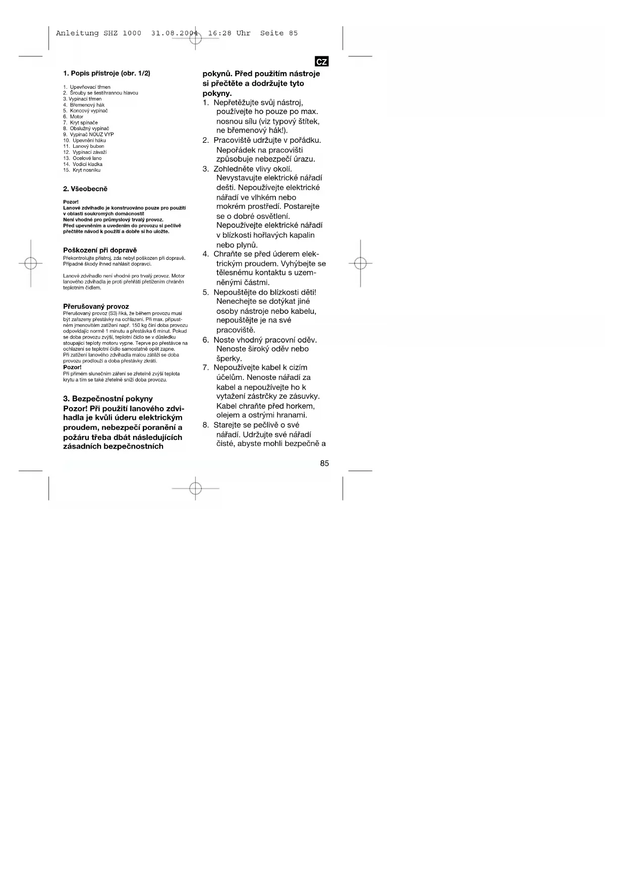 Pozor! Pri pouziti lanoveho zdvihadla je kvuli uderu elektrickym proudem, nebezpeci poraneni a pozaru tbreba dBat nasledujicich zasadnic bepeznochstnic