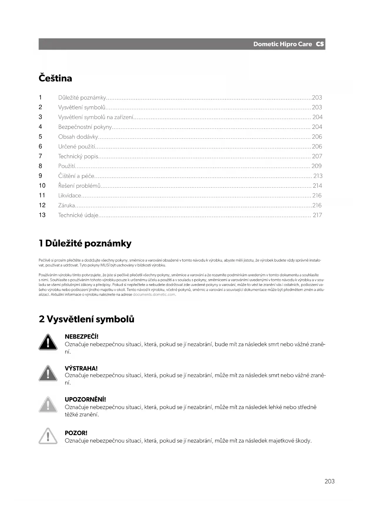 Technické údaje.......................................................................................................................... 217 1 Důležité poznámky Pečlivě si prosím přečtěte adodržujte všechny pokyny, směrnice avarování obsažené vtomto návodu kvýrobku, abyste měli jistotu, že výrobek budete vždy správně instalo- vat, používat audržovat. Tyto pokyny MUSÍ být uschovány vblízkosti výrobku. Používáním výrobku tímto potvrzujete, že jste si pečlivě přečetli všechny pokyny, směrnice avarování aže rozumíte podmínkám uvedeným vtomto dokumentu asouhlasíte snimi. Souhlasíte spoužíváním tohoto výrobku pouze kurčenému účelu apoužití avsouladu spokyny, směrnicemi avarováními uvedenými vtomto návodu kvýrobku avsou- ladu se všemi příslušnými zákony apředpisy. Pokud si nepřečtete anebudete dodržovat zde uvedené pokyny avarování, může to vést ke zranění vás iostatních, poškození va- šeho výrobku nebo poškození jiného majetku vokolí. Tento návod kvýrobku, včetně pokynů, směrnic avarování asouvisející dokumentace může být předmětem změn aaktu- alizací. Aktuální informace ovýrobku naleznete na adresedocuments.dometic.com. 2 Vysvětlení symbolů NEBEZPEČÍ! Označuje nebezpečnou situaci, která, pokud se jí nezabrání, bude mít zanásledek smrt nebo vážné zraně- ní. VÝSTRAHA! Označuje nebezpečnou situaci, která, pokud se jí nezabrání, může mít zanásledek smrt nebo vážné zraně- ní. UPOZORNĚNÍ! Označuje nebezpečnou situaci, která, pokud se jí nezabrání, může mít zanásledek lehké nebo středně těžké zranění. POZOR! Označuje nebezpečnou situaci, která, pokud se jí nezabrání, může mít zanásledek majetkové škody. 203CSDometic Hipro Care POZNÁMKA Doplňující informace týkající se obsluhy výrobku. 3 Vysvětlení symbolů nazařízení Nebezpečí požáru/ hořlaviny 4 Bezpečnostní pokyny Základní bezpečnost VÝSTRAHA! Nebezpečí usmrcení elektrickým proudem