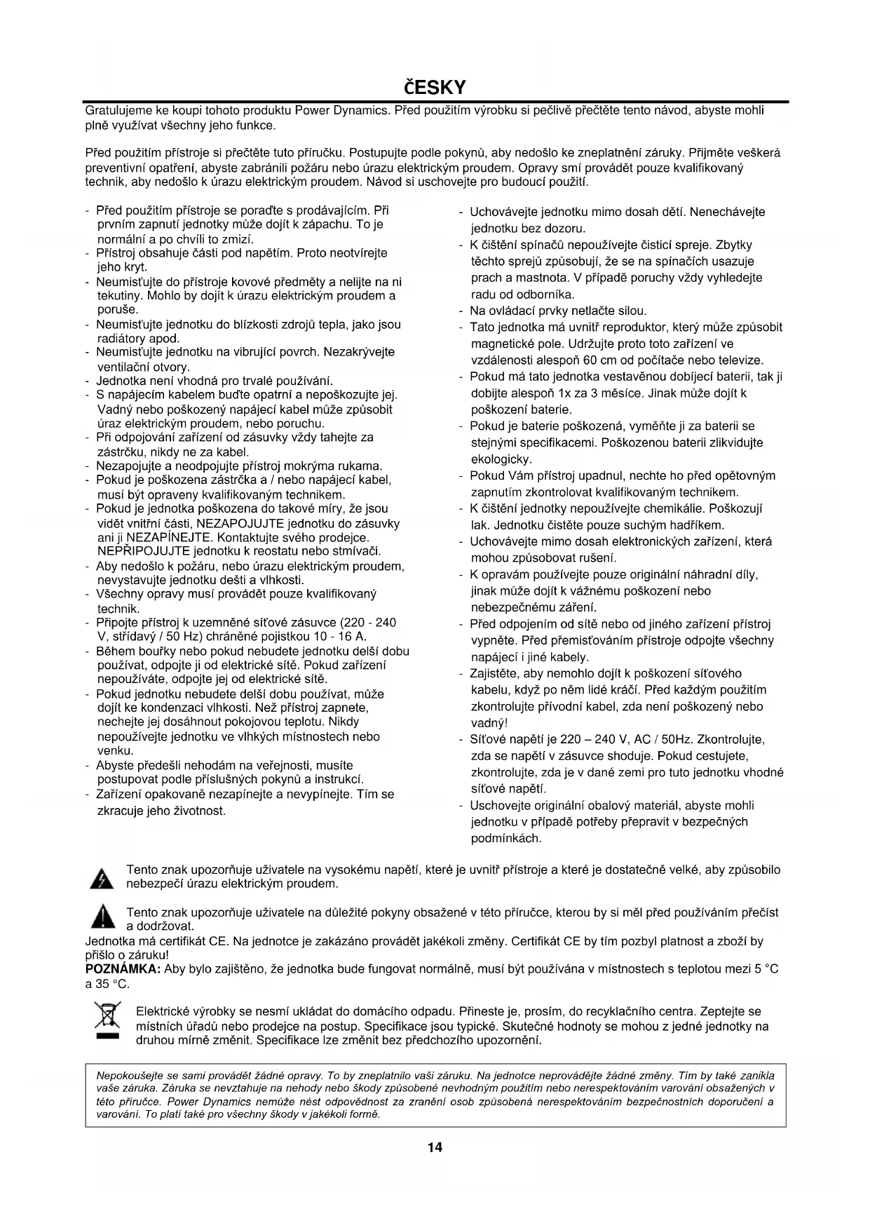Przed podłączeniem przewodu zasilającego należy sprawdzić, czy napięcie w sieci odpowiada napięciu wskazanemu na tabliczce znamionowej urządzenia. Przewód zasilający należy podłączać wyłącznie do gniazda sieciowego z uziemieniem ochronnym WYMIANA BEZPIECZNIKA Jeśli bezpiecznik jest uszkodzony, należy wymienić go na bezpiecznik tego samego typu i o tej samej wartości. Przed wymianą bezpiecznika należy odłączyć przewód zasilający Procedura: Krok 1: Otwórz uchwyt bezpiecznika na tylnym panelu za pomocą odpowiedniego śrubokręta. Krok 2: Wyjmij stary bezpiecznik z uchwytu bezpiecznika. Krok 3: Zainstaluj nowy bezpiecznik w uchwycie bezpiecznika. Krok 4: Umieść uchwyt bezpiecznika w obudowie.14 ČESKY Gratulujeme ke koupi tohoto produktu Power Dynamics. Před použitím výrobku si pečlivě přečtěte tento návod, abyste mohli plně využívat všechny jeho funkce. Před použitím přístroje si přečtěte tuto příručku. Postupujte podle pokynů, aby nedošlo ke zneplatnění záruky. Přijměte veškerá preventivní opatření, abyste zabránili požáru nebo úrazu elektrickým proudem. Opravy smí provádět pouze kvalifikovaný technik, aby nedošlo k úrazu elektrickým proudem. Návod si uschovejte pro budoucí použití. - Před použitím přístroje se poraďte s prodávajícím. Při prvním zapnutí jednotky může dojít k zápachu. To je normální a po chvíli to zmizí. - Přístroj obsahuje části pod napětím. Proto neotvírejte jeho kryt. - Neumisťujte do přístroje kovové předměty a nelijte na ni tekutiny. Mohlo by dojít k úrazu elektrickým proudem a poruše. - Neumisťujte jednotku do blízkosti zdrojů tepla, jako jsou radiátory apod. - Neumisťujte jednotku na vibrující povrch. Nezakrývejte ventilační otvory. - Jednotka není vhodná pro trvalé používání. - S napájecím kabelem buďte opatrní a nepoškozujte jej. Vadný nebo poškozený napájecí kabel může způsobit úraz elektrickým proudem, nebo poruchu. - Při odpojování zařízení od zásuvky vždy tahejte za zástrčku, nikdy ne za kabel. - Nezapojujte a neodpojujte přístroj mokrýma rukama. - Pokud je poškozena zástrčka a / nebo napájecí kabel, musí být opraveny kvalifikovaným technikem. - Pokud je jednotka poškozena do takové míry, že jsou vidět vnitřní části, NEZAPOJUJTE jednotku do zásuvky ani ji NEZAPÍNEJTE. Kontaktujte svého prodejce. NEPŘIPOJUJTE jednotku k reostatu nebo stmívači. - Aby nedošlo k požáru, nebo úrazu elektrickým proudem, nevystavujte jednotku dešti a vlhkosti. - Všechny opravy musí provádět pouze kvalifikovaný technik. - Připojte přístroj k uzemněné síťové zásuvce (220 - 240 V, střídavý / 50 Hz) chráněné pojistkou 10 - 16 A. - Během bouřky nebo pokud nebudete jednotku delší dobu používat, odpojte ji od elektrické sítě. Pokud zařízení nepoužíváte, odpojte jej od elektrické sítě. - Pokud jednotku nebudete delší dobu používat, může dojít ke kondenzaci vlhkosti. Než přístroj zapnete, nechejte jej dosáhnout pokojovou teplotu. Nikdy nepoužívejte jednotku ve vlhkých místnostech nebo venku. - Abyste předešli nehodám na veřejnosti, musíte postupovat podle příslušných pokynů a instrukcí. - Zařízení opakovaně nezapínejte a nevypínejte. Tím se zkracuje jeho životnost. - Uchovávejte jednotku mimo dosah dětí. Nenechávejte jednotku bez dozoru. - K čištění spínačů nepoužívejte čisticí spreje. Zbytky těchto sprejů způsobují, že se na spínačích usazuje prach a mastnota. V případě poruchy vždy vyhledejte radu od odborníka. - Na ovládací prvky netlačte silou. - Tato jednotka má uvnitř reproduktor, který může způsobit magnetické pole. Udržujte proto toto zařízení ve vzdálenosti alespoň 60 cm od počítače nebo televize. - Pokud má tato jednotka vestavěnou dobíjecí baterii, tak ji dobijte alespoň 1x za 3 měsíce. Jinak může dojít k poškození baterie. - Pokud je baterie poškozená, vyměňte ji za baterii se stejnými specifikacemi. Poškozenou baterii zlikvidujte ekologicky. - Pokud Vám přístroj upadnul, nechte ho před opětovným zapnutím zkontrolovat kvalifikovaným technikem. - K čištění jednotky nepoužívejte chemikálie. Poškozují lak. Jednotku čistěte pouze suchým hadříkem. - Uchovávejte mimo dosah elektronických zařízení, která mohou způsobovat rušení. - K opravám používejte pouze originální náhradní díly, jinak může dojít k vážnému poškození nebo nebezpečnému záření. - Před odpojením od sítě nebo od jiného zařízení přístroj vypněte. Před přemisťováním přístroje odpojte všechny napájecí i jiné kabely. - Zajistěte, aby nemohlo dojít k poškození síťového kabelu, když po něm lidé kráčí. Před každým použitím zkontrolujte přívodní kabel, zda není poškozený nebo vadný! - Síťové napětí je 220 – 240 V, AC / 50Hz. Zkontrolujte, zda se napětí v zásuvce shoduje. Pokud cestujete, zkontrolujte, zda je v dané zemi pro tuto jednotku vhodné síťové napětí. - Uschovejte originální obalový materiál, abyste mohli jednotku v případě potřeby přepravit v bezpečných podmínkách. Tento znak upozorňuje uživatele na vysokému napětí, které je uvnitř přístroje a které je dostatečně velké, aby způsobilo nebezpečí úrazu elektrickým proudem. Tento znak upozorňuje uživatele na důležité pokyny obsažené v této příručce, kterou by si měl před používáním přečíst a dodržovat. Jednotka má certifikát CE. Na jednotce je zakázáno provádět jakékoli změny. Certifikát CE by tím pozbyl platnost a zboží by přišlo o záruku! POZNÁMKA: Aby bylo zajištěno, že jednotka bude fungovat normálně, musí být používána v místnostech s teplotou mezi 5 °C a 35 °C. Elektrické výrobky se nesmí ukládat do domácího odpadu. Přineste je, prosím, do recy